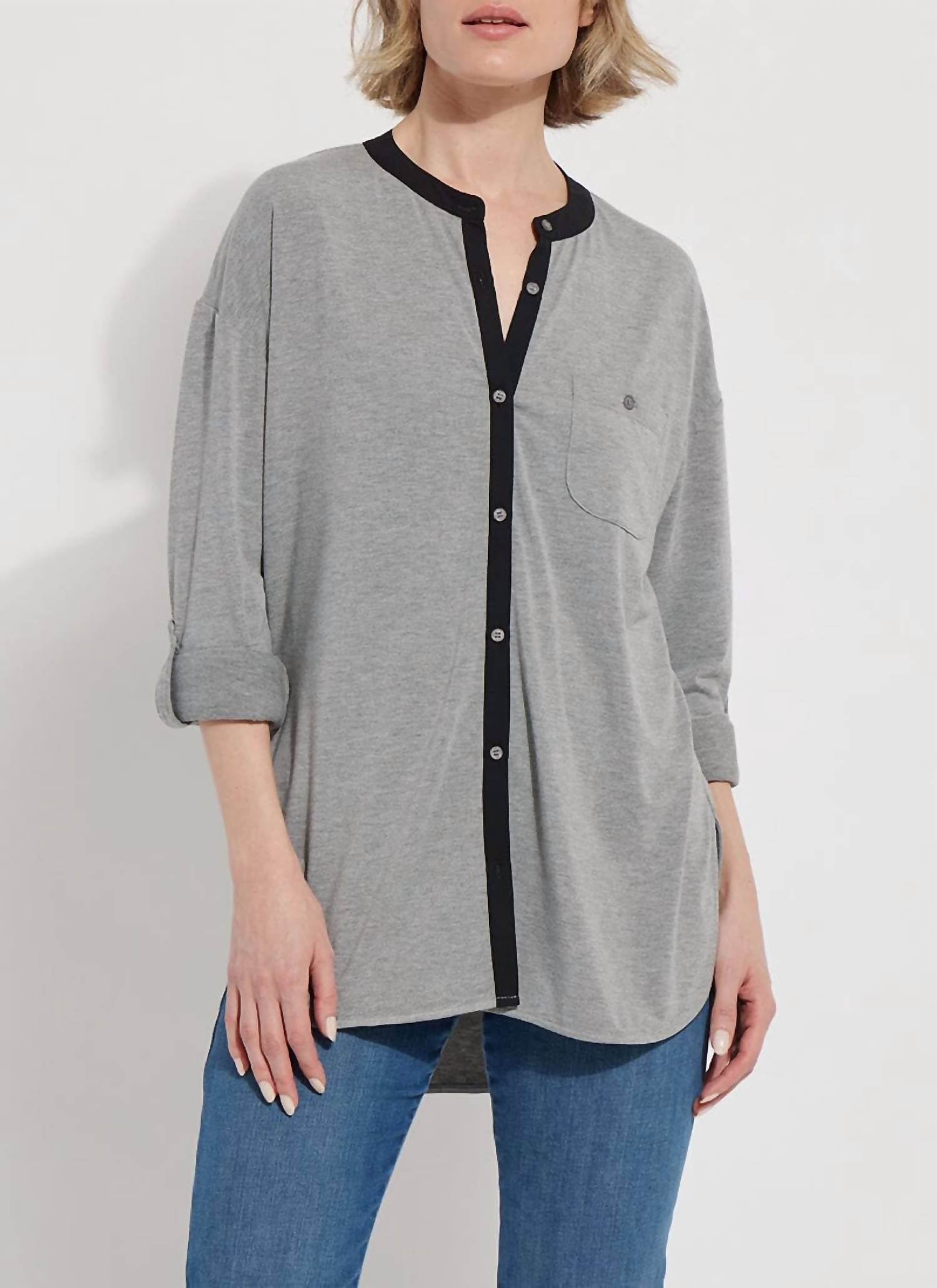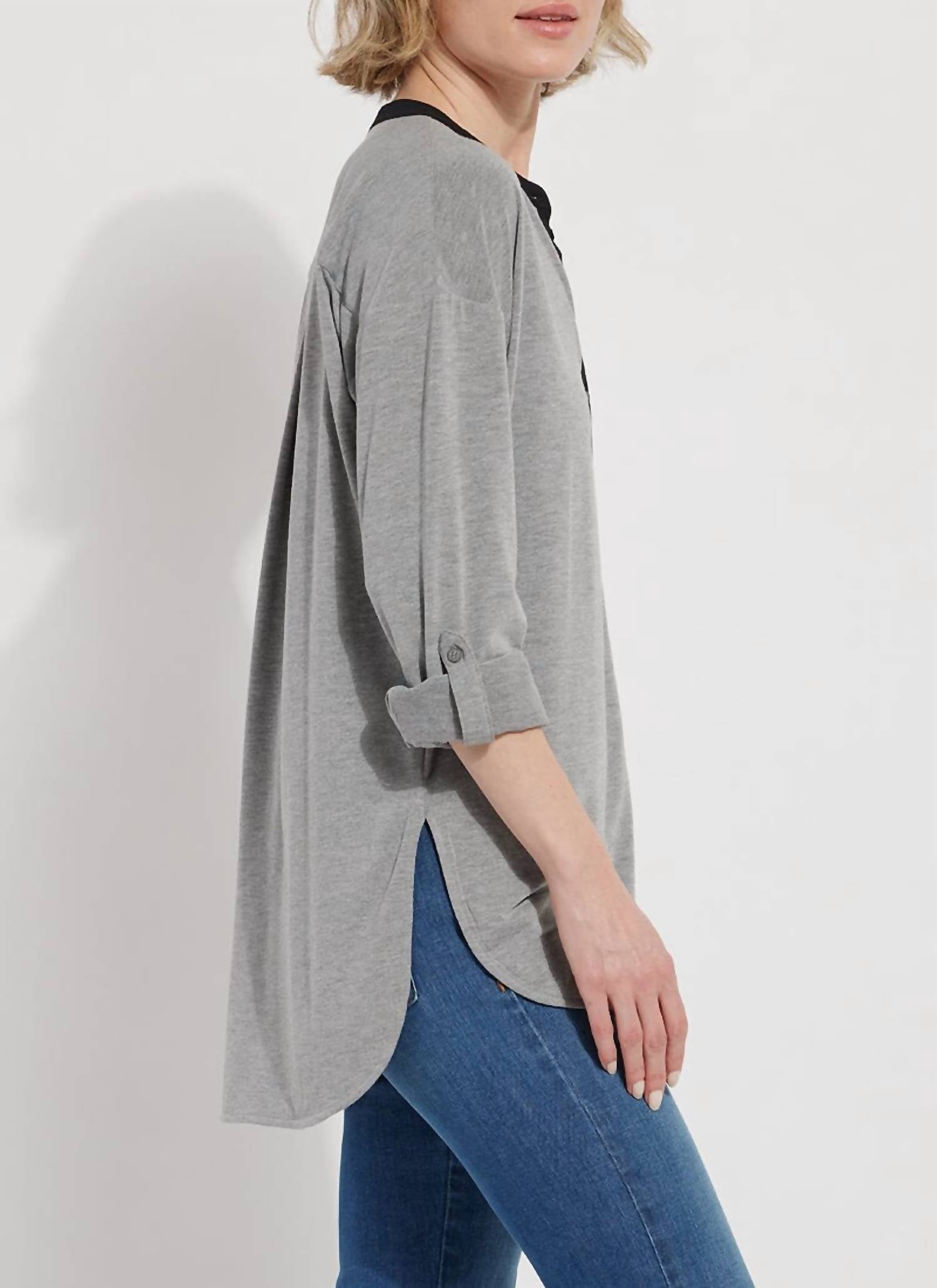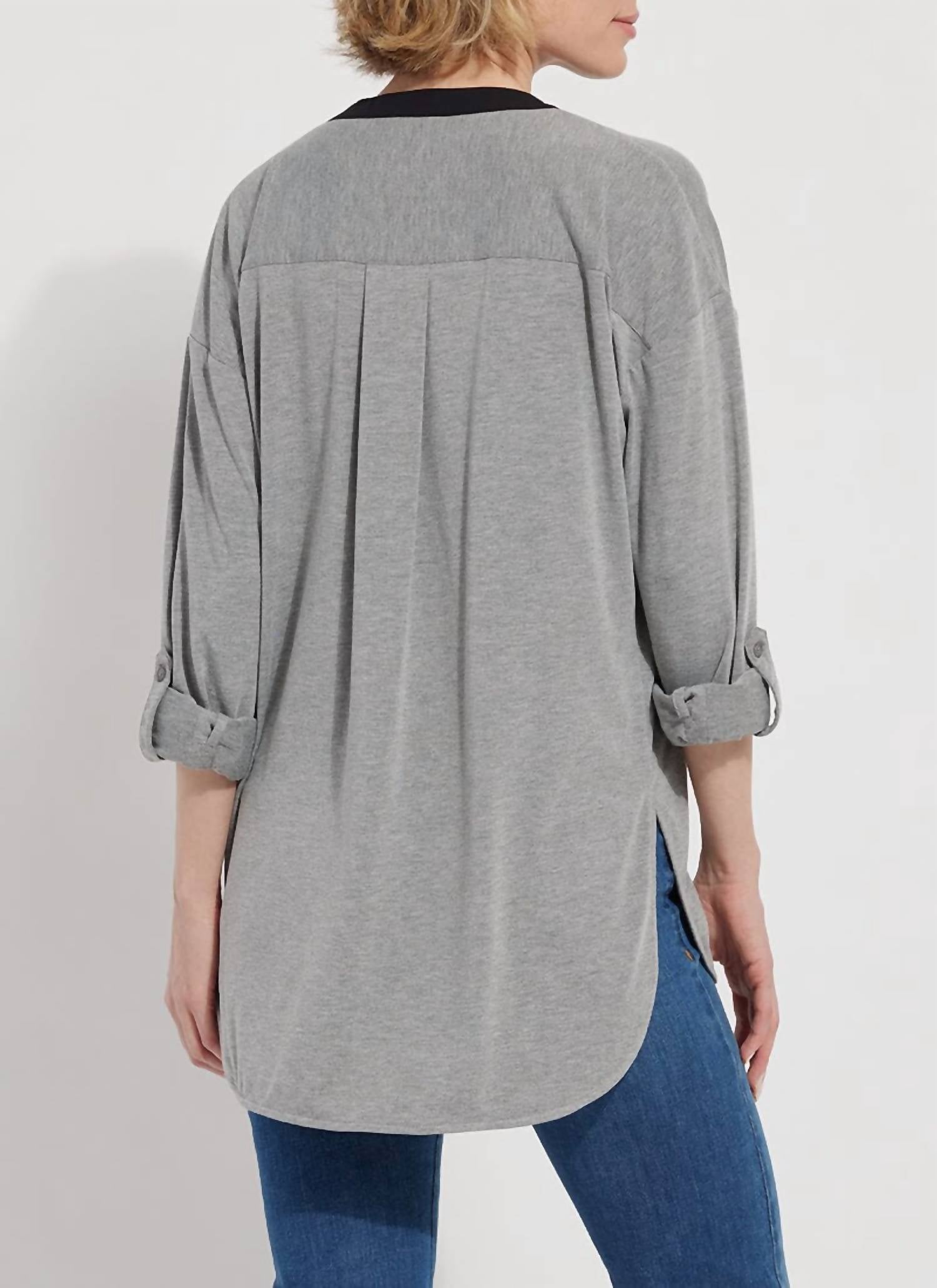 Conheça a Camisa Zola Jersey da Lysse, uma blusa cinza mesclada de manga comprida perfeita para combinar com leggings. Esta camisa oversized, com uma mistura de 61% poliéster, 34% rayon e 5% elastano, inclui uma carcela frontal e gola com acabamento em georgette. Equipada com mangas com abas dobráveis, um bolso frontal aplicado e uma bainha com barra reta, oferece funcionalidade e estilo. Fechamento: Aperto de botão. A modelo tem 1,78 m e veste tamanho P.