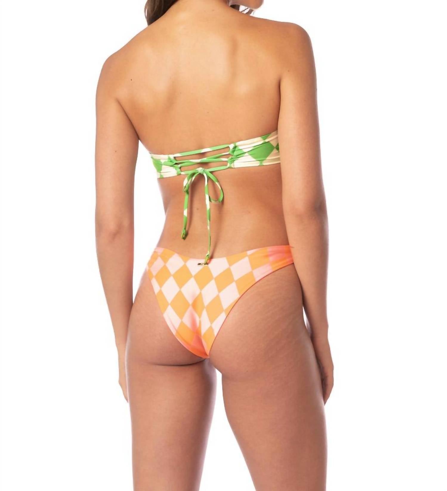 Dream of your next beach getaway in this cute little number. Pair with strappy sandals, a floppy hat, and an oversized tote to complete the perfect vacation look. Introducing the Diamond Sour Splendour Bikini Bottom by MAAJI, a bold blend of orange and green geometric patterns perfect for your summer beach days. Crafted with a high-rise fit and cheeky coverage, the thin side design ensures comfort and style. Made in Colombia from 76% polyester and 24% spandex, this reversible piece offers versatility with a guaranteed reversible print. Care: Hand wash and line dry to preserve its vibrant look. Model Alyne Lira is wearing a size small (5'9" height, 34.2" bust, 24.8" waist, 35.4" hips).