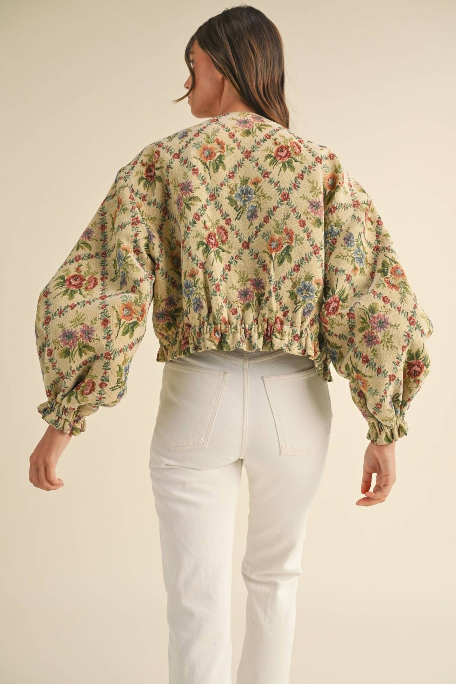 Elevate your wardrobe with the Floral Bomber Jacket by MABLE, offering a vintage-inspired charm in green/multi. This cropped jacket features long sleeves and a stunning floral print on tapestry fabric, perfect for travel during the winter season. Crafted from 70% Polyester and 30% Rayon, it comes lined for added comfort. Closure: Button closure.