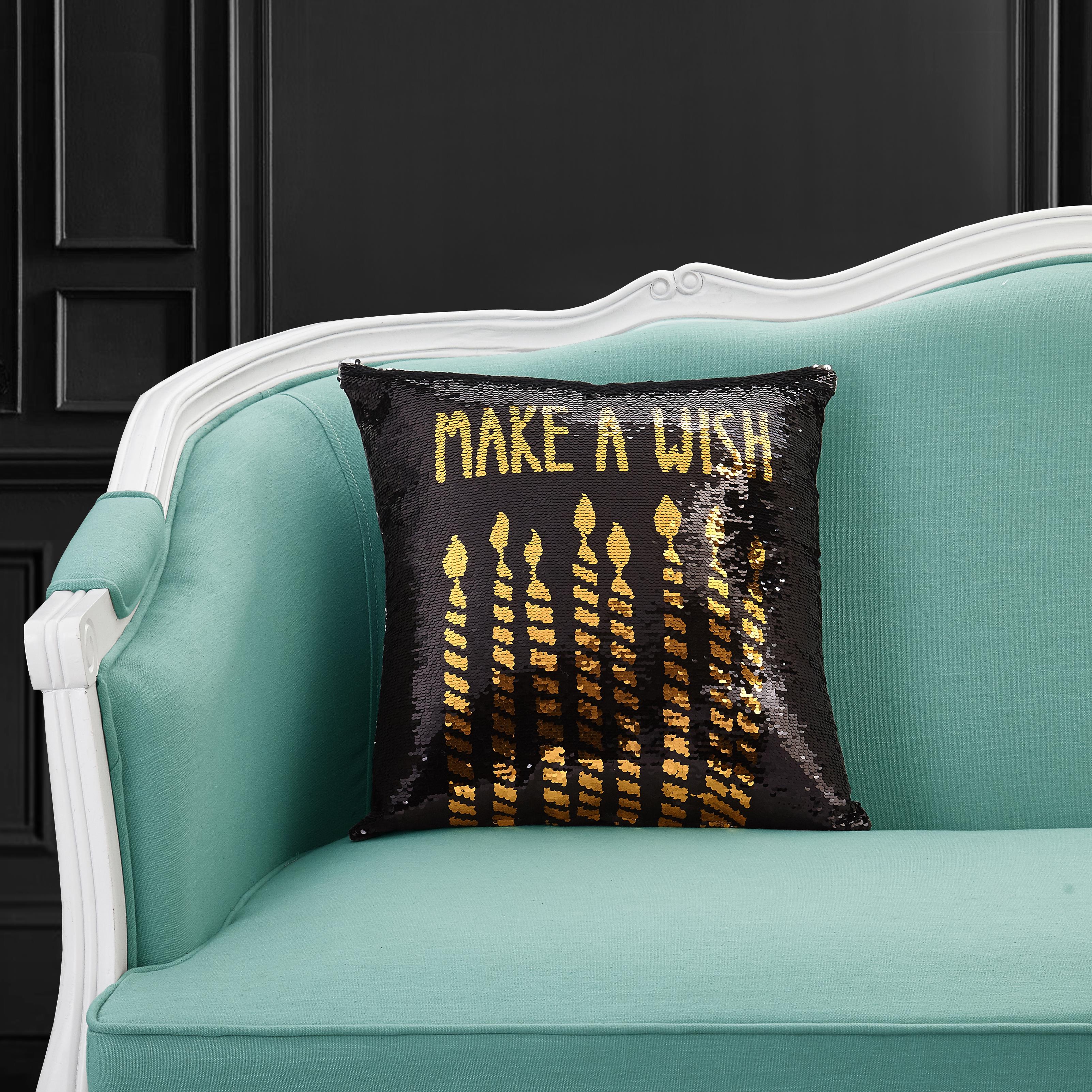 Material: 100% poliéster. | Almofada decorativa reversível com estampa de lantejoulas. | Design exclusivo com frase "Faça um Desejo". | Tamanho da almofada: 43 cm x 43 cm.