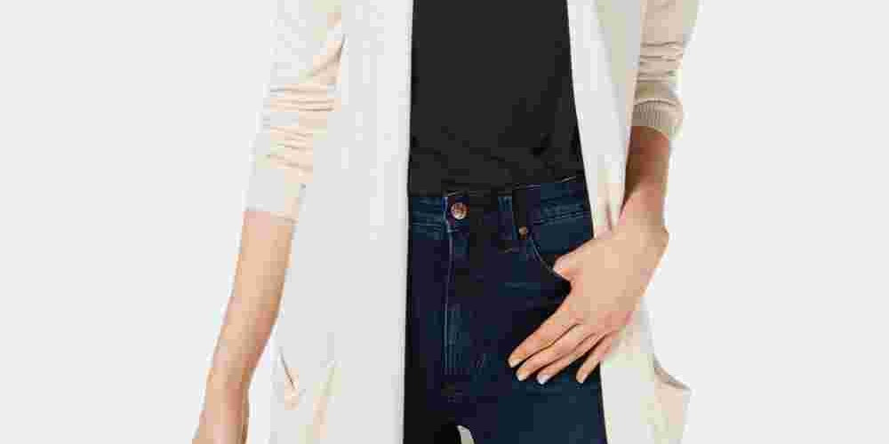 Cardigan feminino longo de malha aberta na frente, bege escuro, tamanho médio, Maison Jules