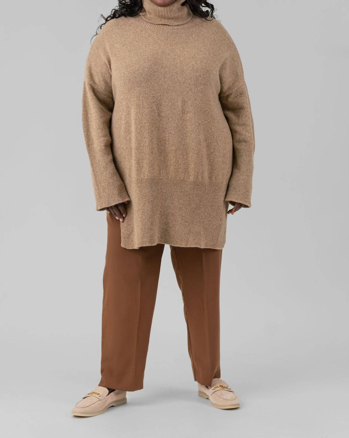 Introducing the Galice Long Loose Sweater by Maison Montagut, a preppy winter essential in a solid camel shade. This women's turtleneck sweater features long sleeves and is crafted from a luxurious cashmere blend, perfect for dinner parties. It showcases a pull-on closure with low armholes and long ribbed finishes for added style. To maintain the quality, machine wash and lay flat to dry.
