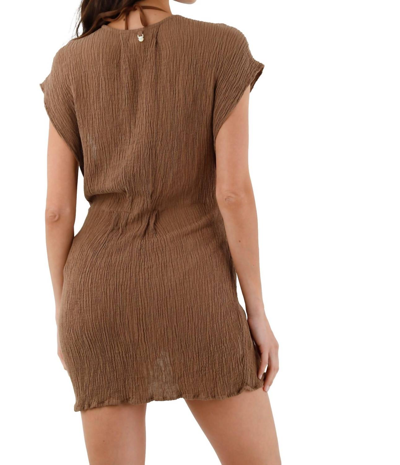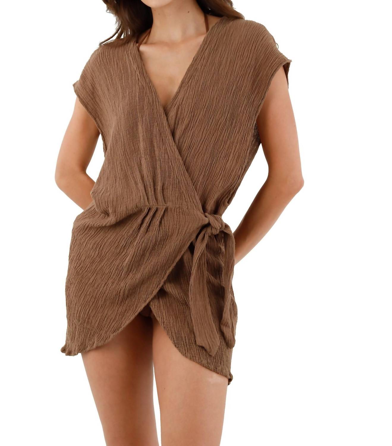 The perfect mini dress for those warmer months. Embrace effortless elegance with the Malai Jezebel Dress, a cap sleeve mini dress perfect for beach days. Crafted in a stunning Earth Brown, its wrap silhouette is complemented by a V-neckline and a textured pattern. Closure: Tie closure ensures a flattering fit. Care: Hand wash and lay flat to dry for lasting quality.