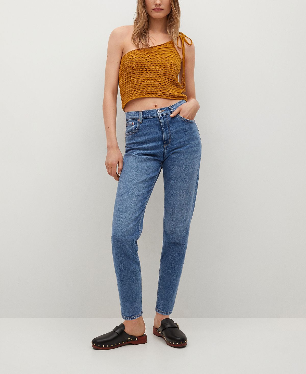 Esta calça jeans mom fit da Mango é exclusiva para mulheres que adoram ser reconhecidas por suas escolhas de moda. Sua construção em tecido de algodão estilo jeans | design reto | cintura alta | passadores | fecho de zíper e botão único | e 5 bolsos a tornam adorável. | 5 bolsos