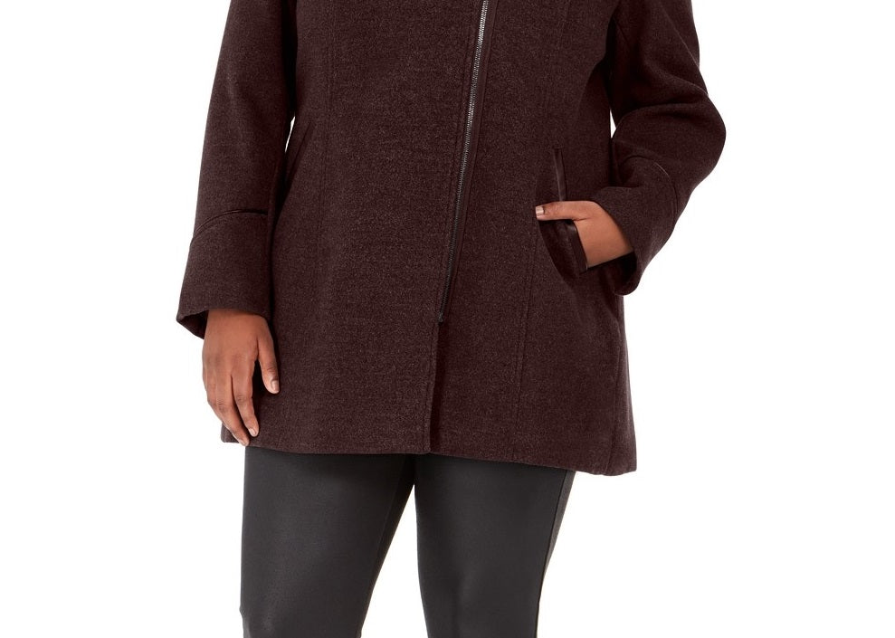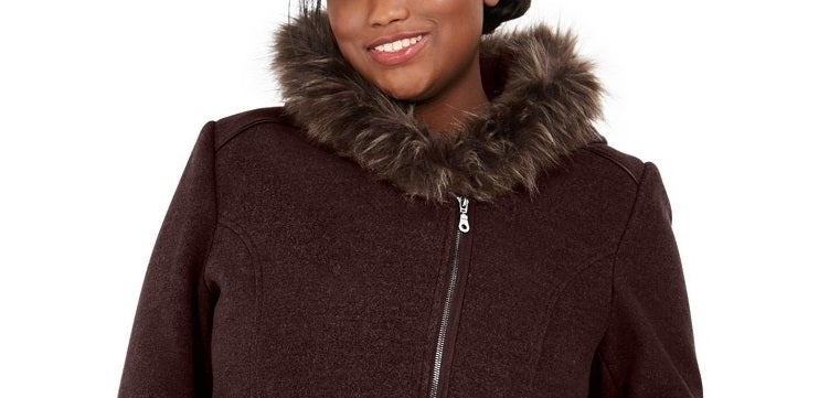 A altura da modelo veste tamanho 0X | Comprimento aproximado: 33-1/4" do centro das costas até a bainha | Sem gola, com capuz e acabamento em pele sintética; fecho de zíper assimétrico na frente | Bolsos com fenda nos quadris | Forrado | Poliéster/viscose/elastano; forro e acabamento em pele sintética: poliéster | Lavagem a seco