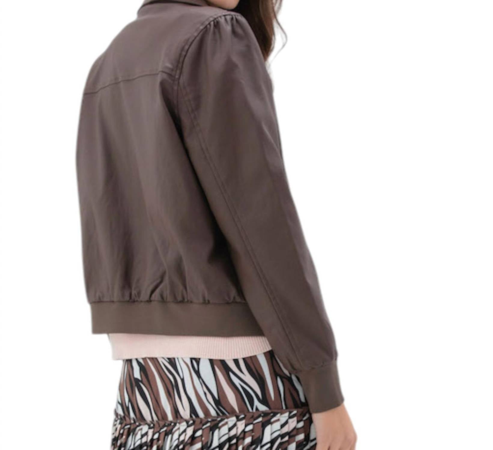 Uma jaqueta chique na cor chocolate, com mangas compridas, ombros franzidos e bainha canelada elástica para um ajuste relaxado. Confeccionada em 76% viscose, 21% poliamida e 3% elastano, com forro de 55% poliéster e 45% viscose. Possui zíper frontal e pode ser lavada somente à mão para facilitar os cuidados.