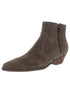 Pequenos detalhes em tachas e zíperes dão um toque ousado ao design inspirado no western das botas de cano curto Wanida da Marc Fisher. | Salto 1-1/2 | Botas de cano curto com bico fino e fecho de zíper | Detalhes em tachas e zíper no cabedal | Cabedal em camurça ou couro; forro em couro; sola sintética | Importado