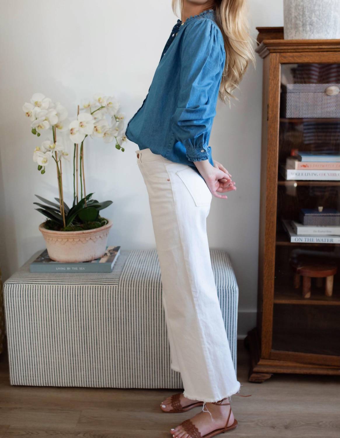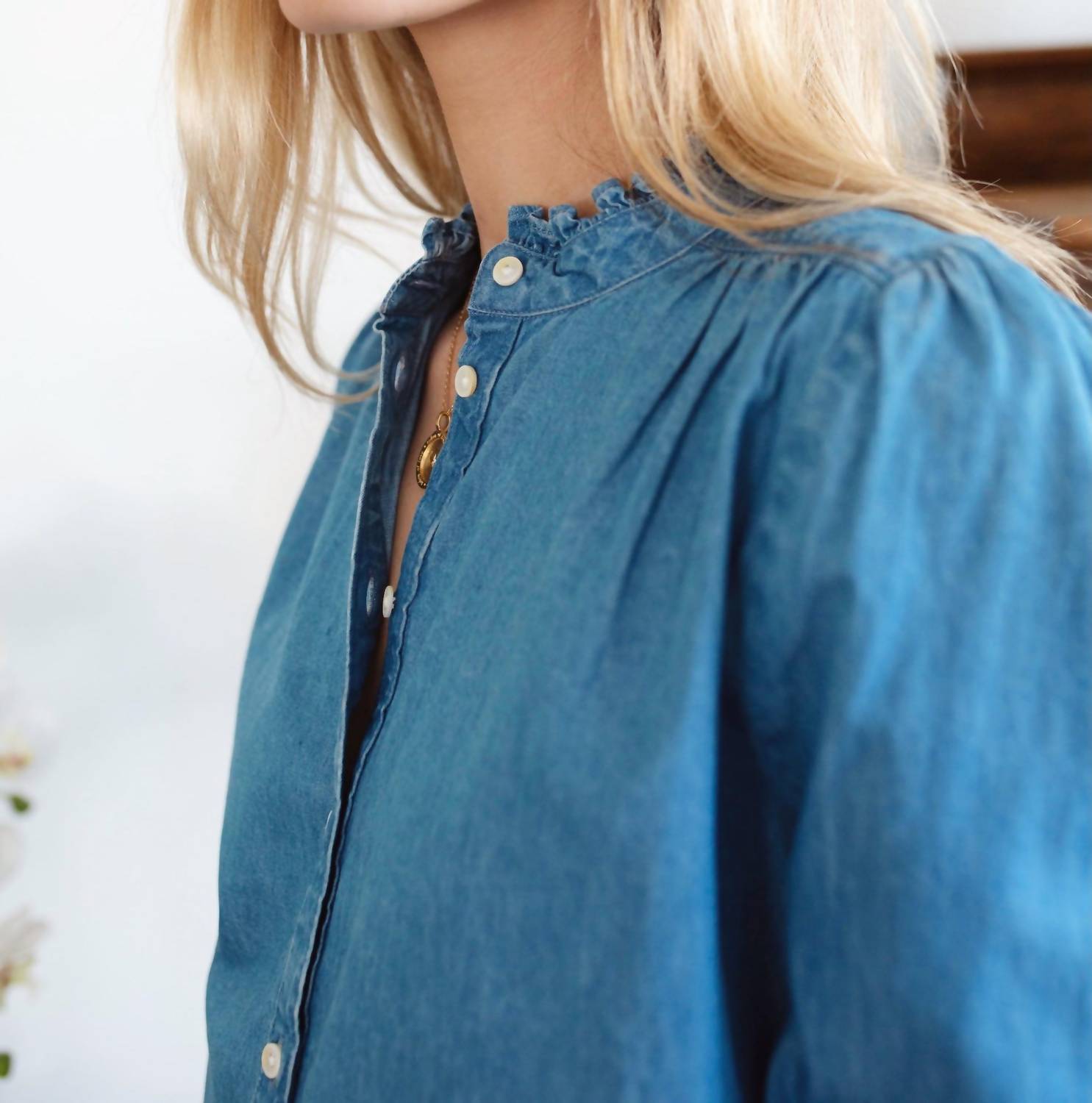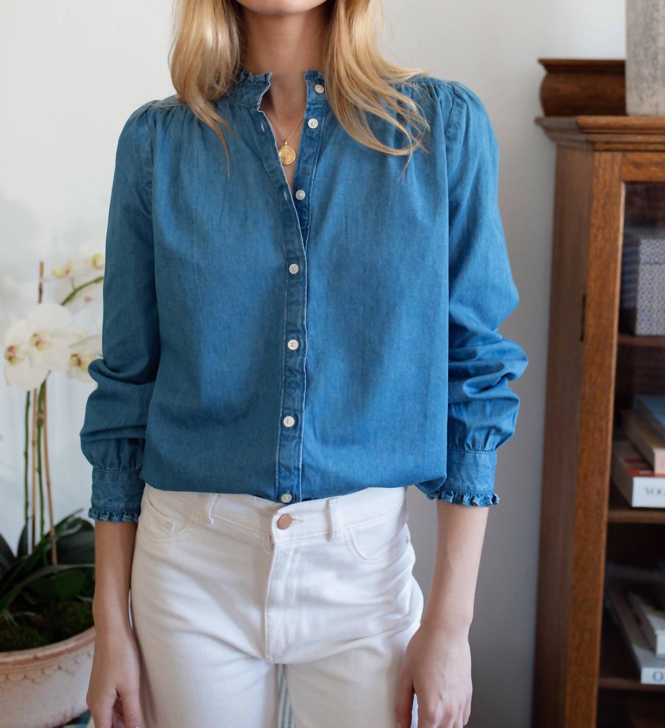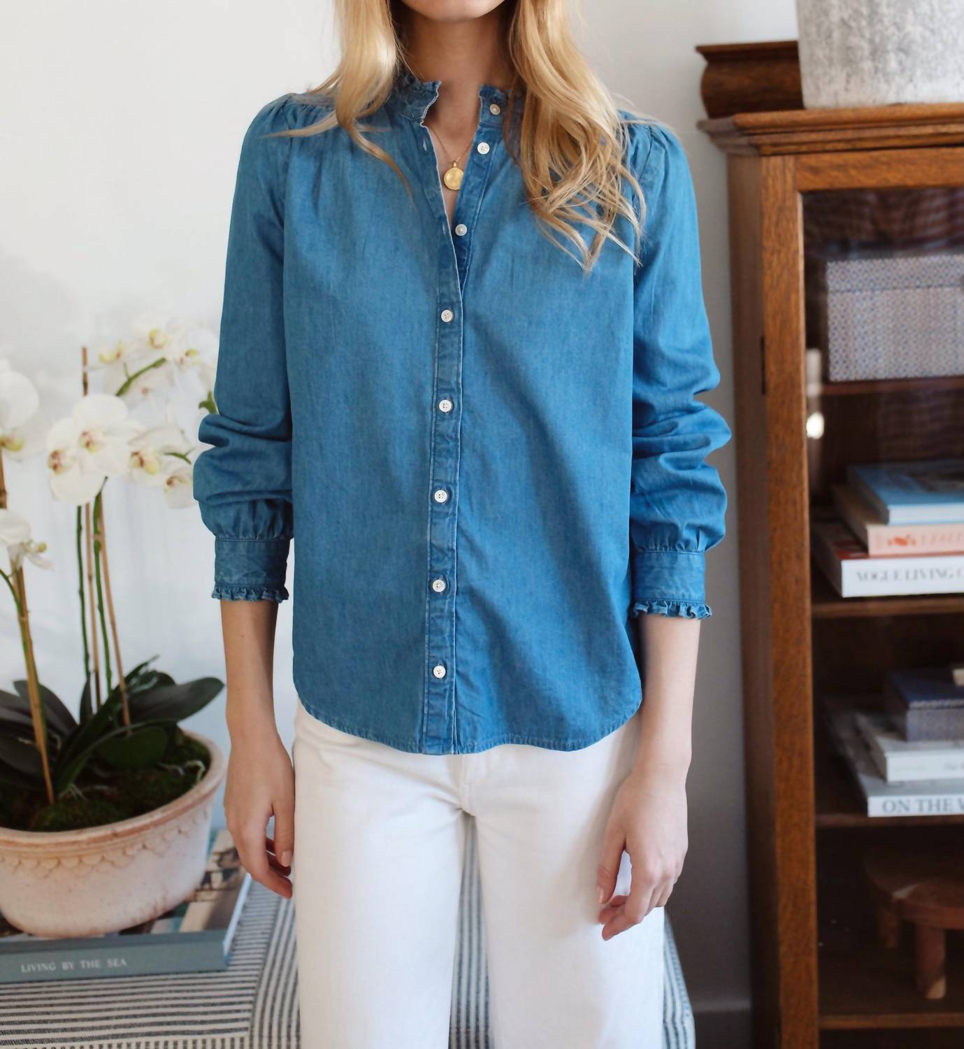 Introducing the Charlie Shirt Chambray by Marea, a minimalist and timeless button-down ideal for Spring celebrations like the 4th of July. This women's shirt features delicate long sleeves with mini ruffle trims, adding effortless charm to your wardrobe. Made from solid chambray 100% Cotton, it has a 25-inch garment length and a classic collar neckline. Closure: Full button closure. Care: Hand wash and lay flat to dry.