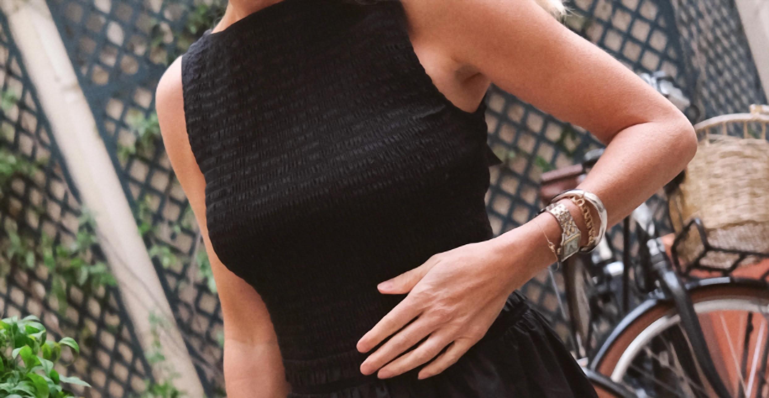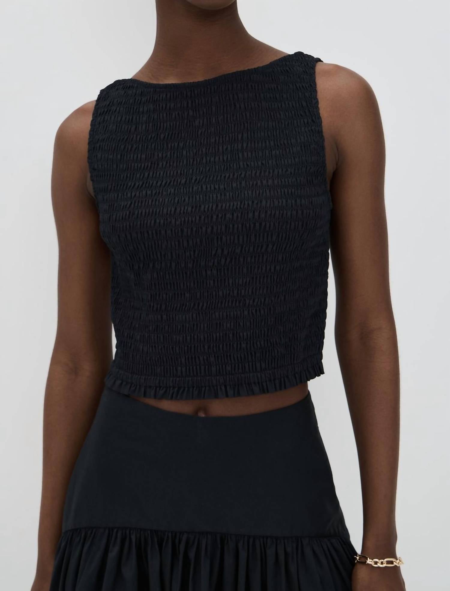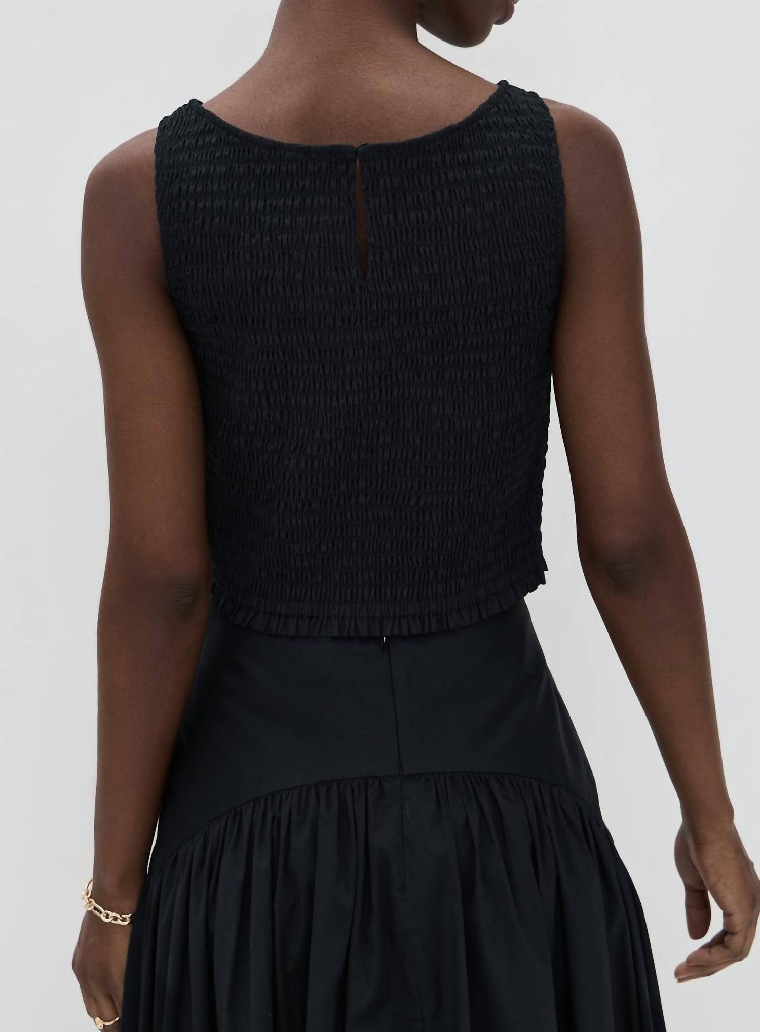Show a little skin in this cute and casual crop top. Discover the Charlotte Top by Marea, a minimalist and versatile staple in sleek black. This sleeveless crop top is crafted from comfortable cotton, featuring a flattering smocked silhouette and a classic boatneck neckline. It is designed with a delicate keyhole button closure at the back and hits perfectly at the natural waist. Proudly made in China, this piece requires dry cleaning for care. 100% cotton.