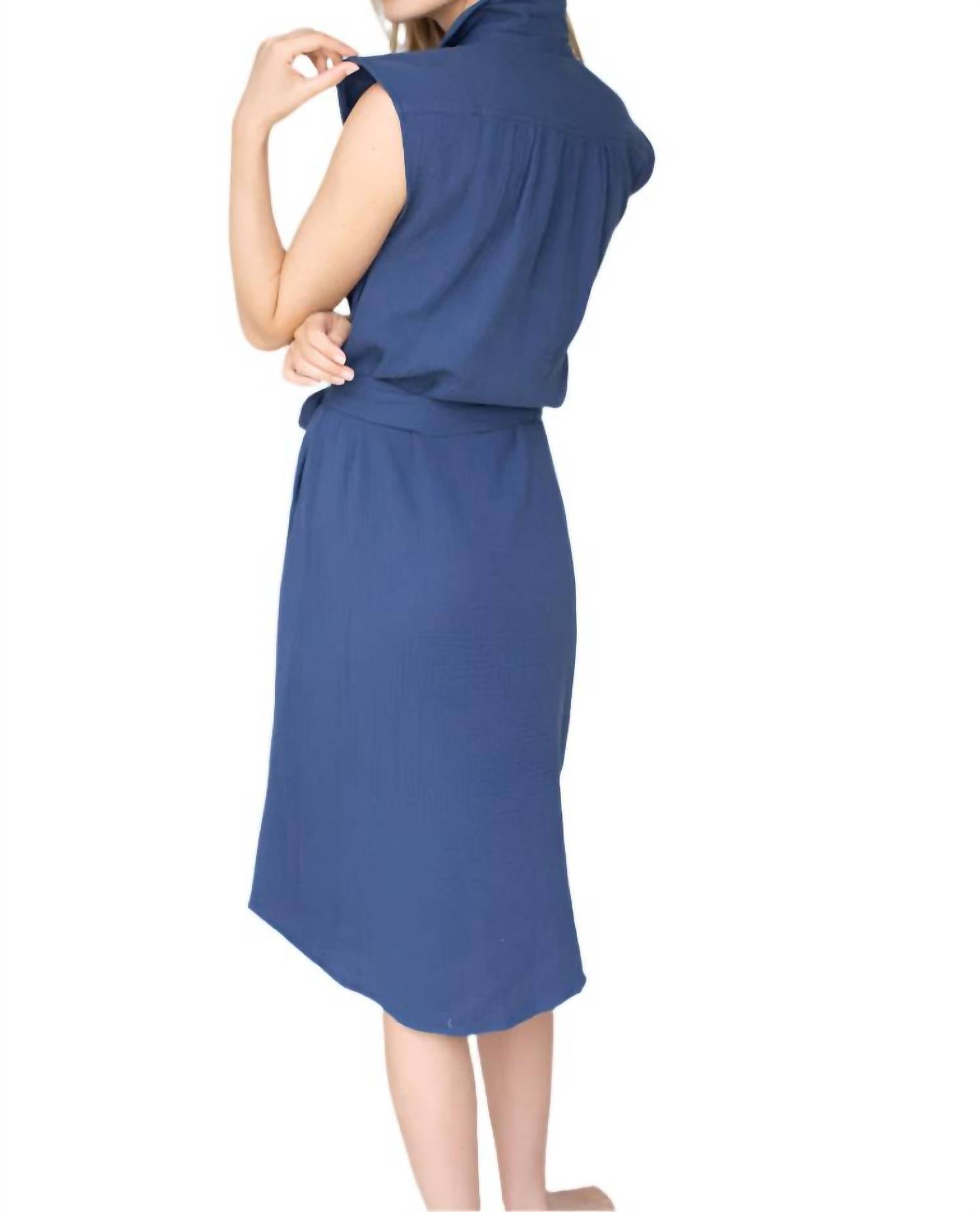 Just add slides or mules and you are good to go. Introducing the Joanne Dress by Marea, an essential piece for sun-filled adventures and breezy summer moments. This captivating indigo gauze dress features cap sleeves and a versatile A-line silhouette, perfect for any holiday party. Made from 100% cotton, it's designed with a button closure and functional pockets for a refined yet relaxed look. Effortlessly minimalist in a solid pattern, this dress is your go-to choice for ease and style.