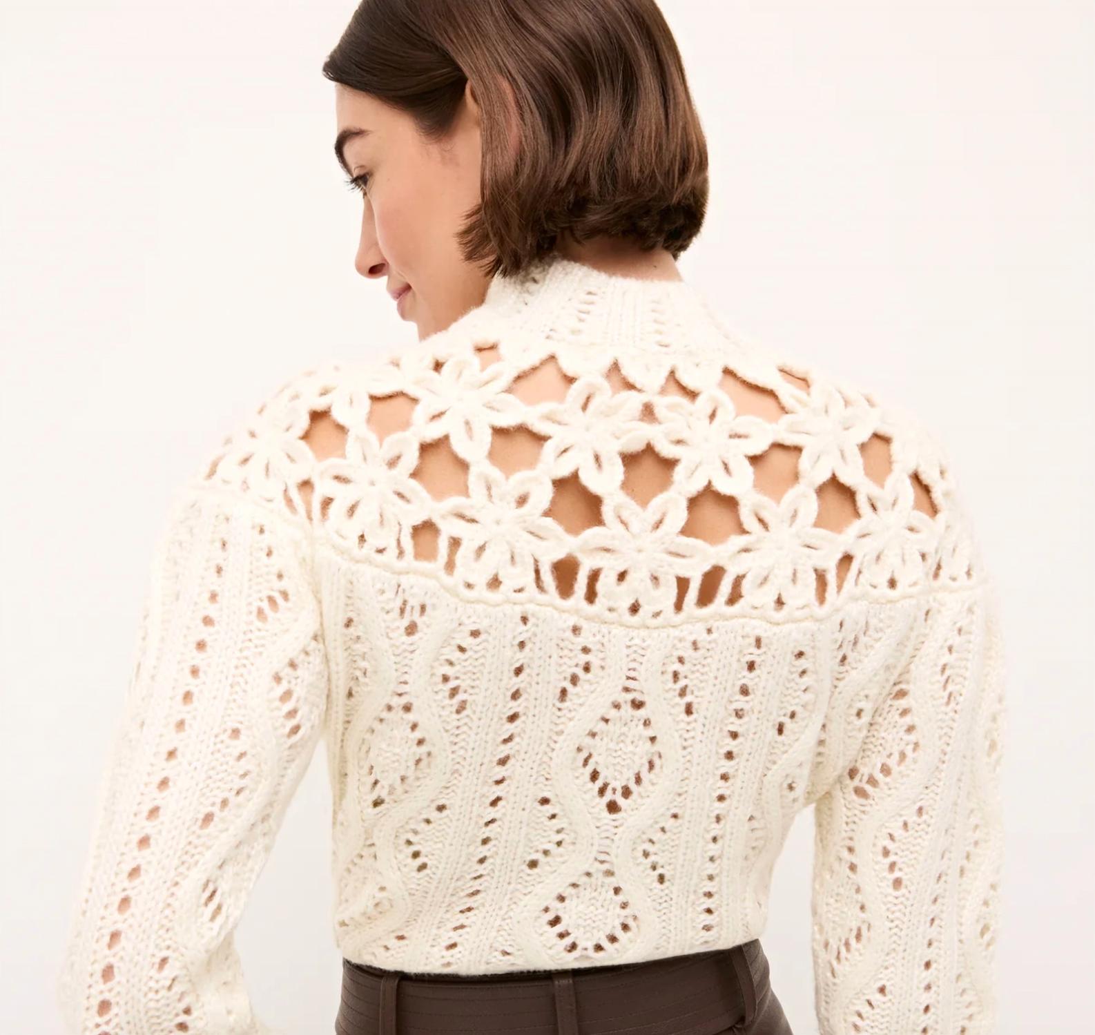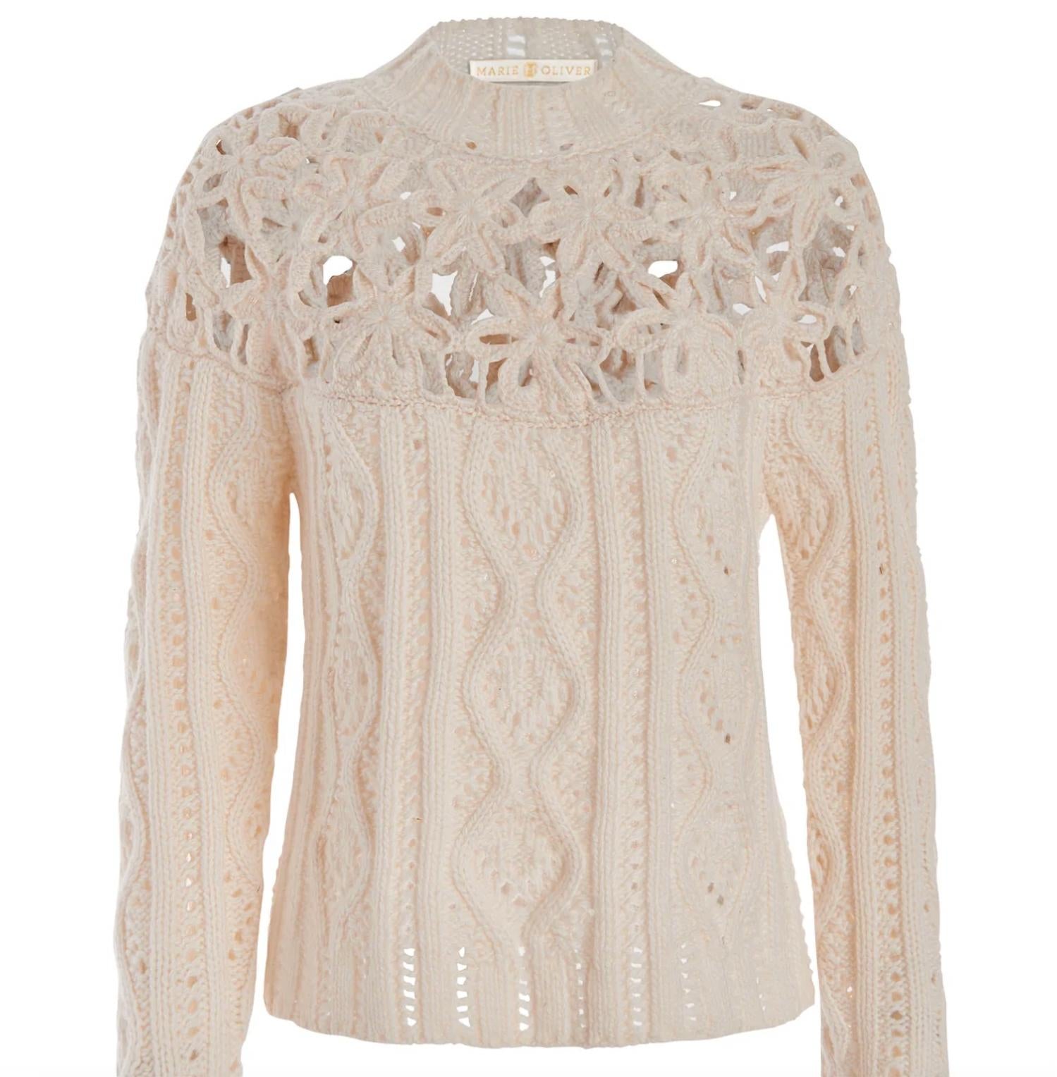 Apresentamos o Suéter Flora da Marie Oliver, uma peça-chave para o guarda-roupa exigente. Este suéter branco de inverno possui mangas compridas e um elegante jugo floral em malha aberta, perfeito para adicionar textura e elegância. Confeccionada em uma luxuosa mistura de lã (73% lã, 27% poliéster), esta peça texturizada apresenta detalhes em malha trançada e canelada nas mangas e no corpo. Desenhada com gola alta e estilo pull-on para uma sofisticação sem esforço.