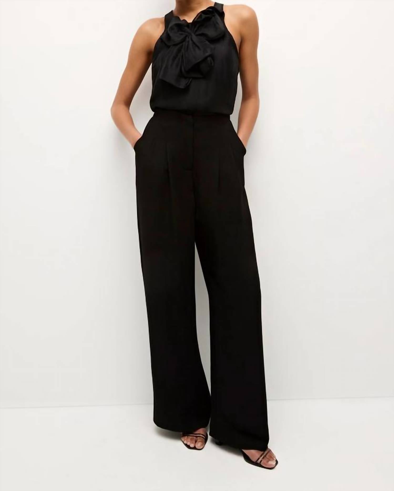 Presenting the Indira Top by Marie Oliver, a sophisticated sleeveless blouse in elegant black. Crafted from a luxurious blend of 61% linen and 39% silk, this piece is designed with a distinctive oversized bow across the chest and a fitted silhouette. The halter neckline and invisible zipper with a hook & eye closure at the back ensure an impeccable fit for special occasions. Care Instructions: Dry clean only.