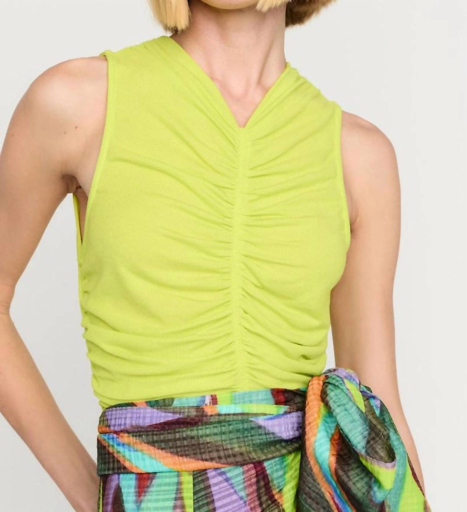 Esta regata sem mangas e justa ao corpo apresenta um decote em V alto e um franzido marcante no centro para um ajuste perfeito. Confeccionada em 96% modal e 4% elastano, oferece uma sensação de segunda pele, perfeita para a primavera e o verão. Vista. Lave na máquina em ciclo delicado e deixe secar na horizontal.