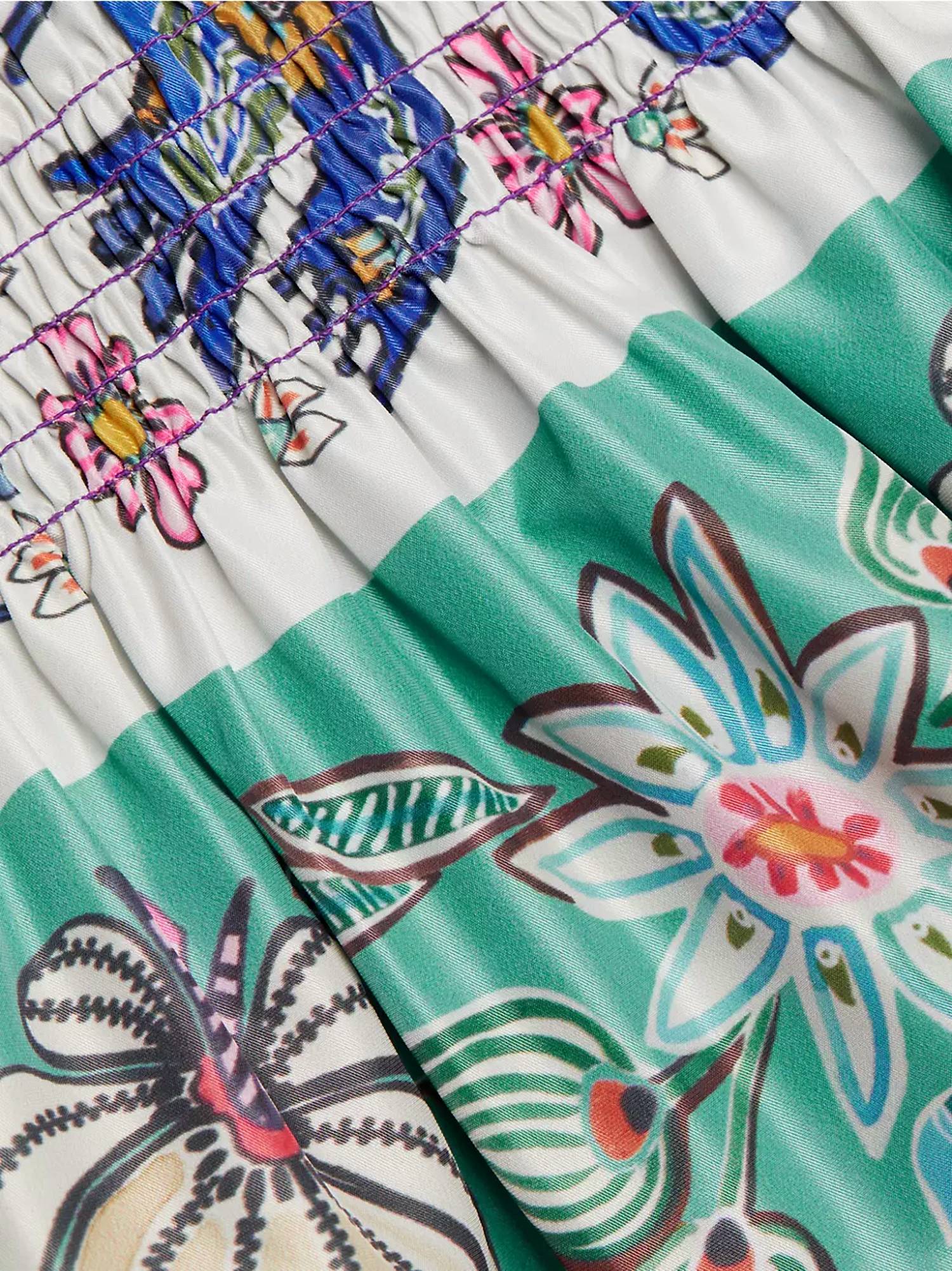 Esta regata apresenta um corpete justo e uma gola falsa funil para um toque de elegância. Confeccionada em 100% poliéster, apresenta uma estampa de inspiração tropical e inclui um zíper invisível central nas costas, tornando-a perfeita para ocasiões casuais e formais.