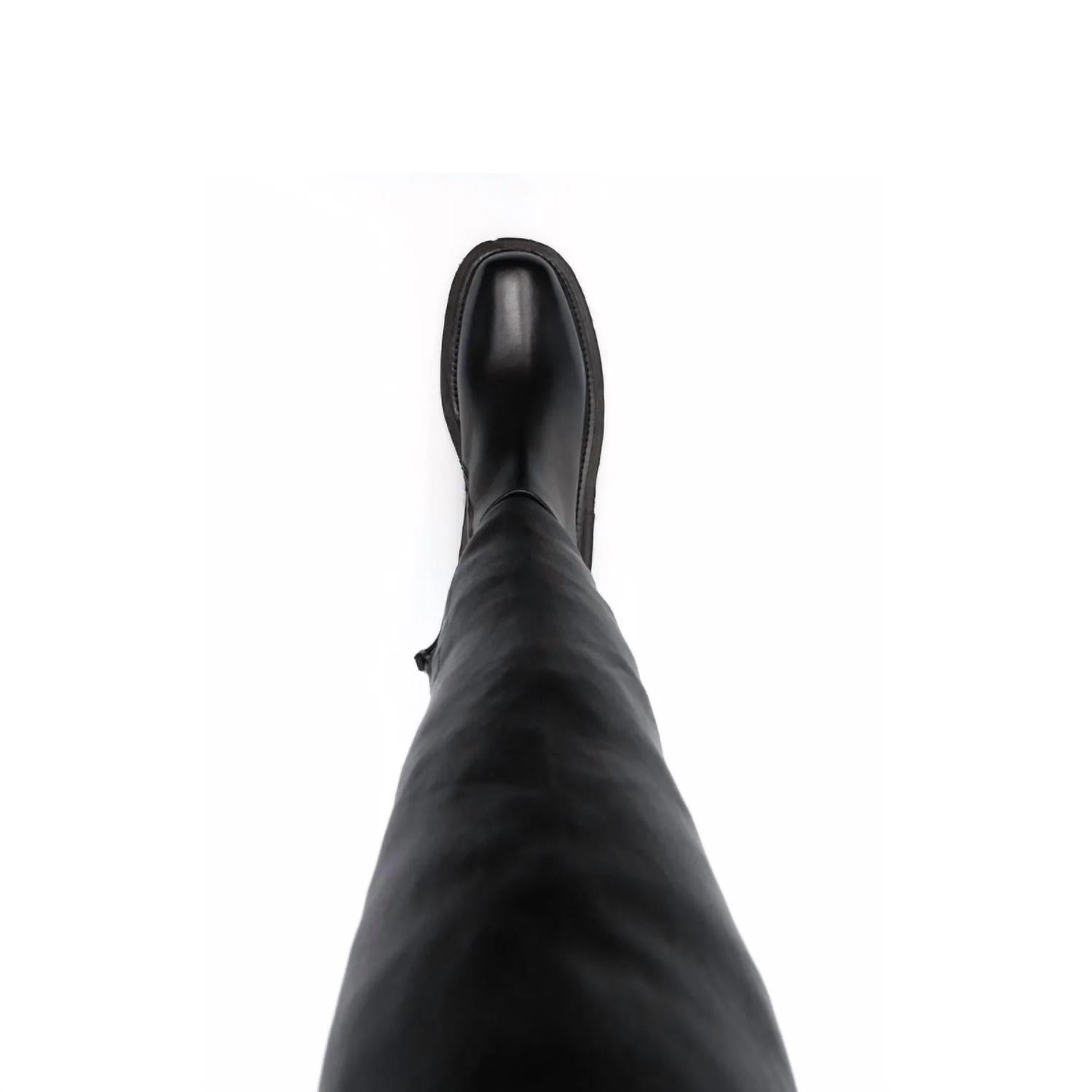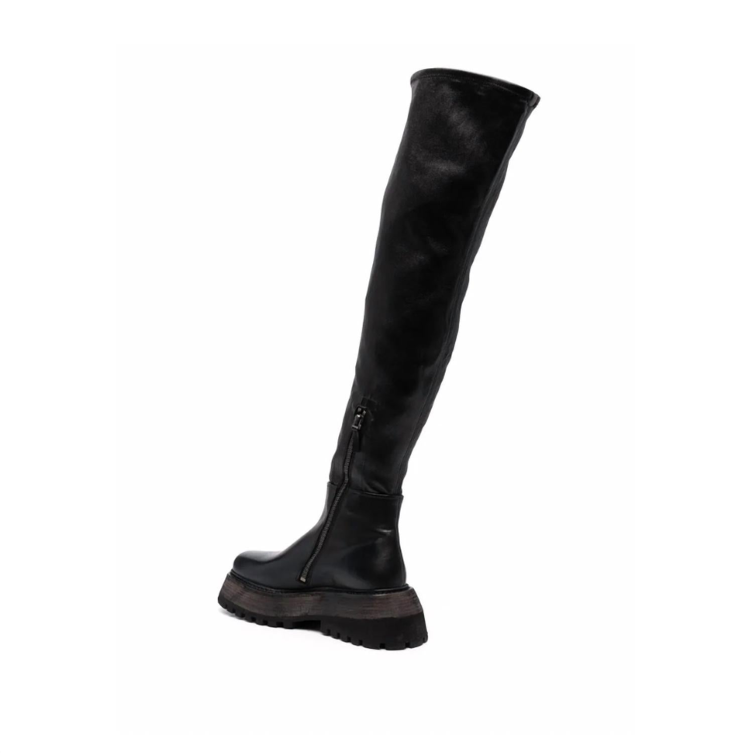 A trend that is here to stay. Discover the Marsèll Over-the-Knee Platform Leather Boots, a striking blend of utilitarian luxury and bold style. Crafted from 100% smooth black leather in Italy, these boots boast a commanding over-the-knee design with a sleek, combat-inspired silhouette. The rounded toe and rubber-lugged platform sole offer both elevated edge and ground-gripping function. Ideal for those who embrace dramatic style with a nod to 90s fashion.