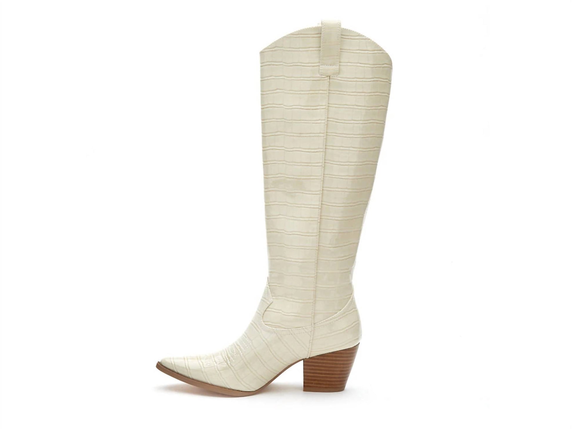 DESCRIPTION: The Jax boot has striped pattern and pointed toe to provide a trendy look to any of your outfits. This Western-inspired knee high boot has tonal stitching accents for a unique style and traction sole to deliver optimum support and stability. FEATURES: Synthetic upper. Pull-on. Pointed toe. Synthetic lining. Lightly cushioned footbed. Approx. 16" shaft height. Approx. 15" circumference. 2" stacked block heel. Synthetic sole. Imported