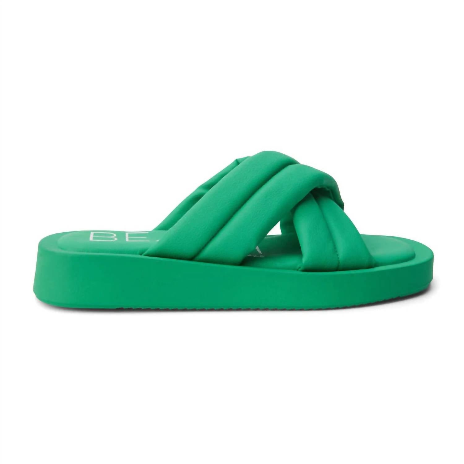 Step into effortless style with Matisse's Women's Piper Slide in a vibrant green, perfect for summer streetwear. These sandals feature a vegan-friendly synthetic leather upper with a soft synthetic leather lining for added comfort. The 1.25-inch wedge heel pairs elegantly with a 0.75-inch platform for a subtle lift, while the slip-on style ensures easy wear. Proudly imported, this puffy crisscross sandal is ideal for beach days and Easter celebrations.