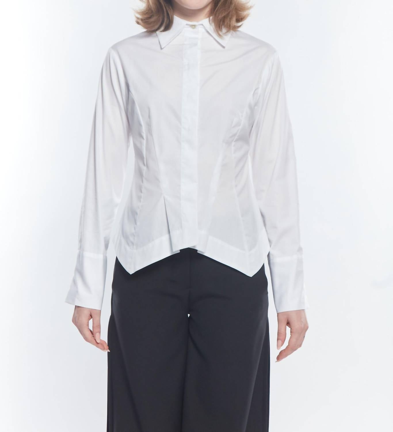 Uma camisa clássica de botões que nunca sai de moda. Descubra a Camisa Plissada Beam com Botões da Matthildur, uma peça básica sofisticada confeccionada em algodão Pima branco impecável. Esta camisa feminina com botões apresenta mangas compridas e gola, com barra recortada e detalhes assimétricos que esbanjam elegância moderna. Fechamento: Botão. Cuidados: Lavar à máquina e secar na secadora.