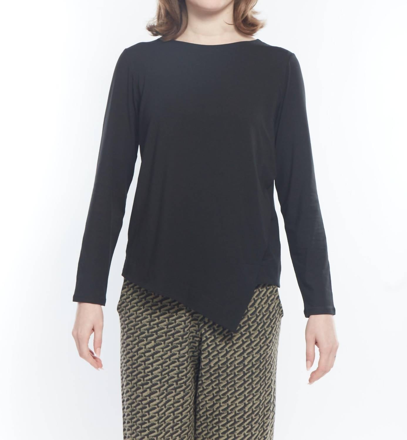 Apresentamos a blusa de manga comprida Gymno da Matthildur, uma peça deslumbrante criada para mulheres que apreciam elegância refinada. Esta blusa preta lisa apresenta mangas compridas e decote canoa, confeccionada em algodão confortável para um visual elegante. Com uma frente descentrada exclusiva combinada com costas retas, é perfeita para causar impacto. Fechamento: Puxe para vestir. Cuidados: Lavar à máquina e secar na secadora.