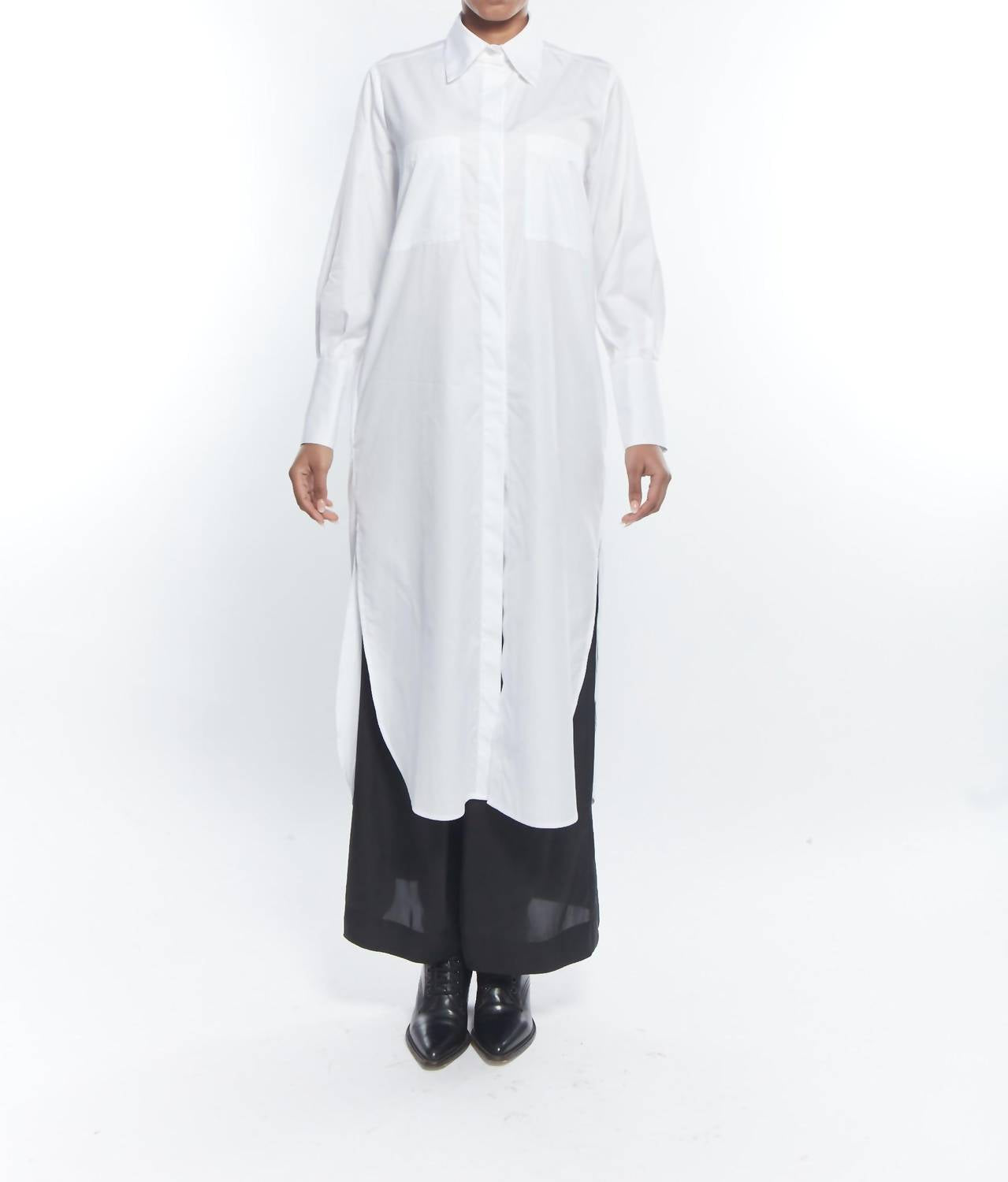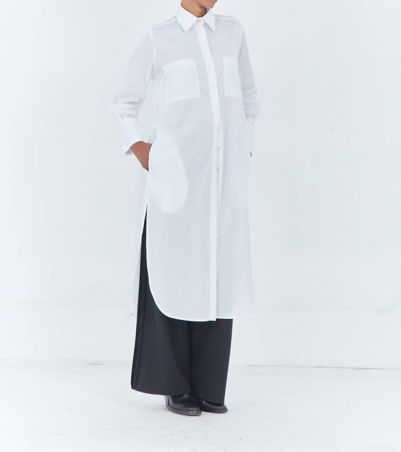 Descubra a Camisa Longa Moderna da Matthildur, uma peça marcante que redefine os limites da moda tradicional. Esta camisa branca com estampa lisa apresenta mangas compridas e gola clássica para uma silhueta elegante. Confeccionada em algodão premium, possui fecho prático por botões e bolsos práticos. Versátil para qualquer look, esta camisa pode ser lavada na máquina e seca na secadora.