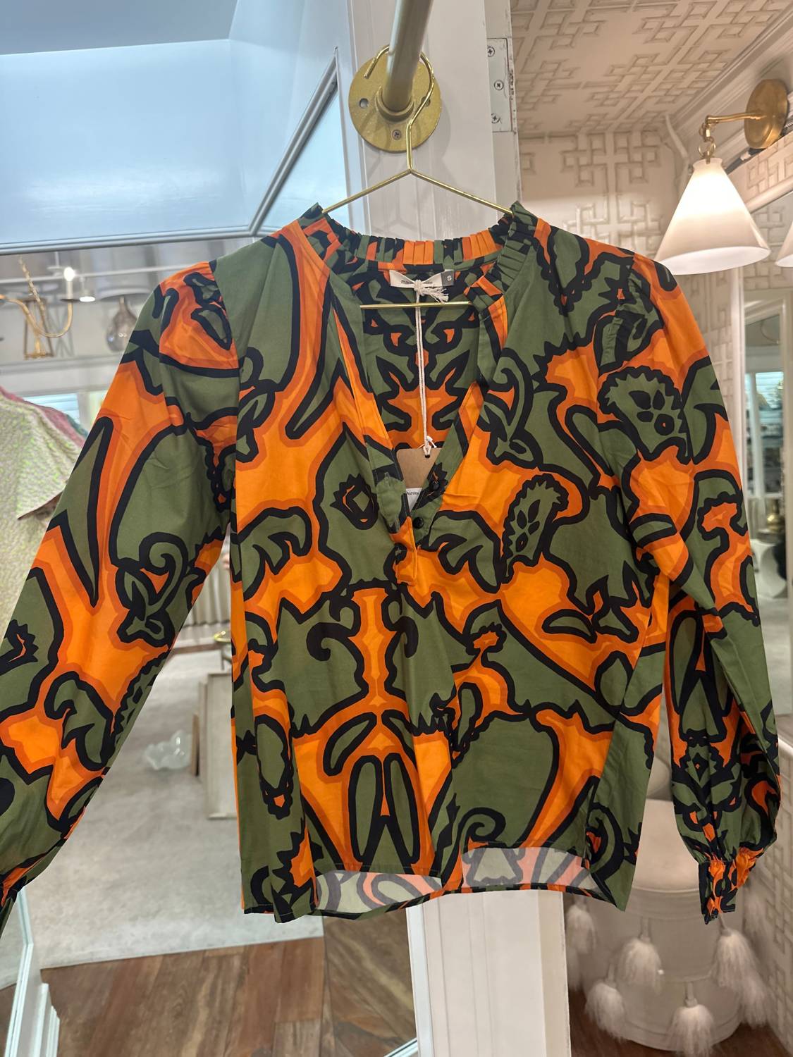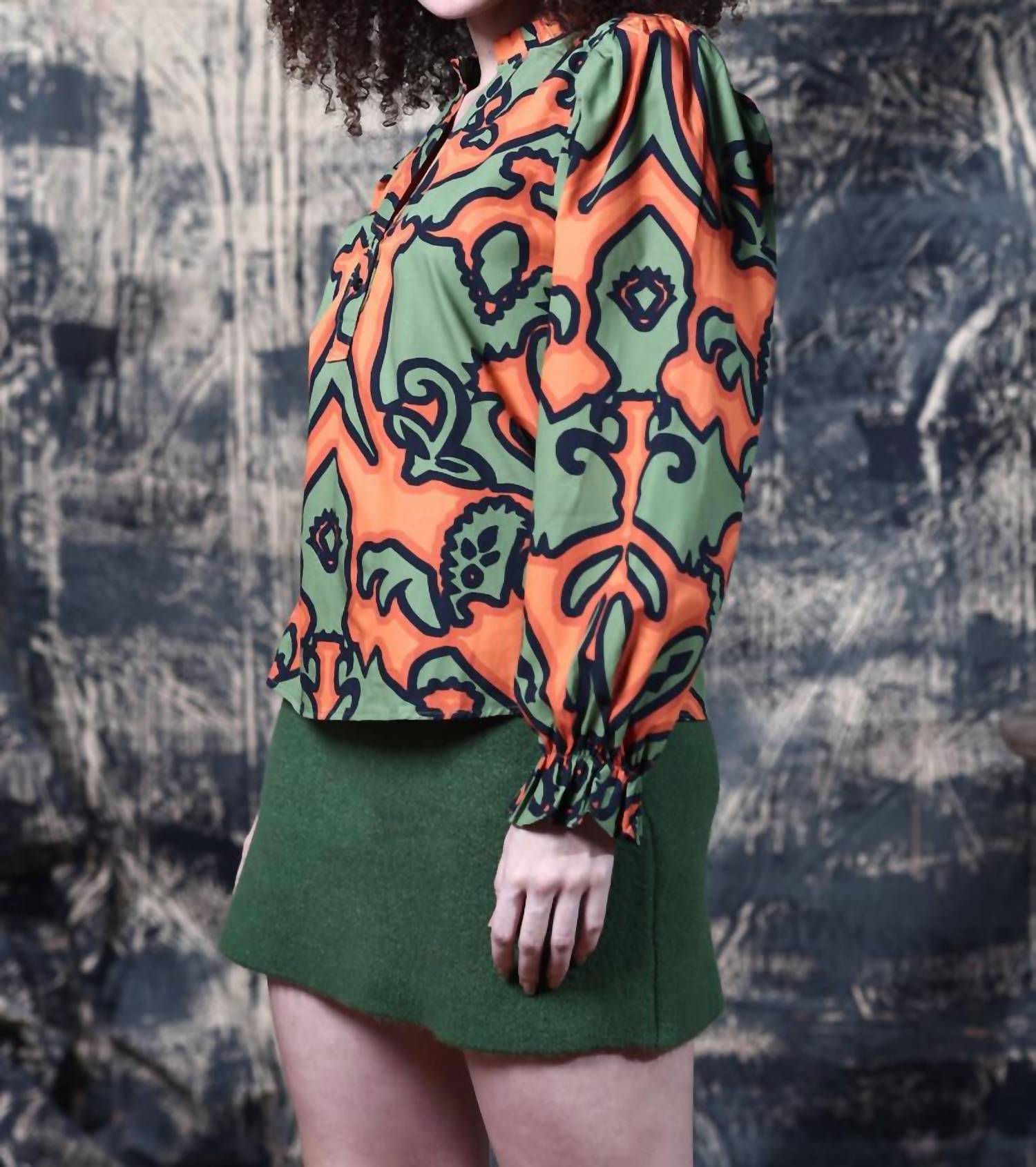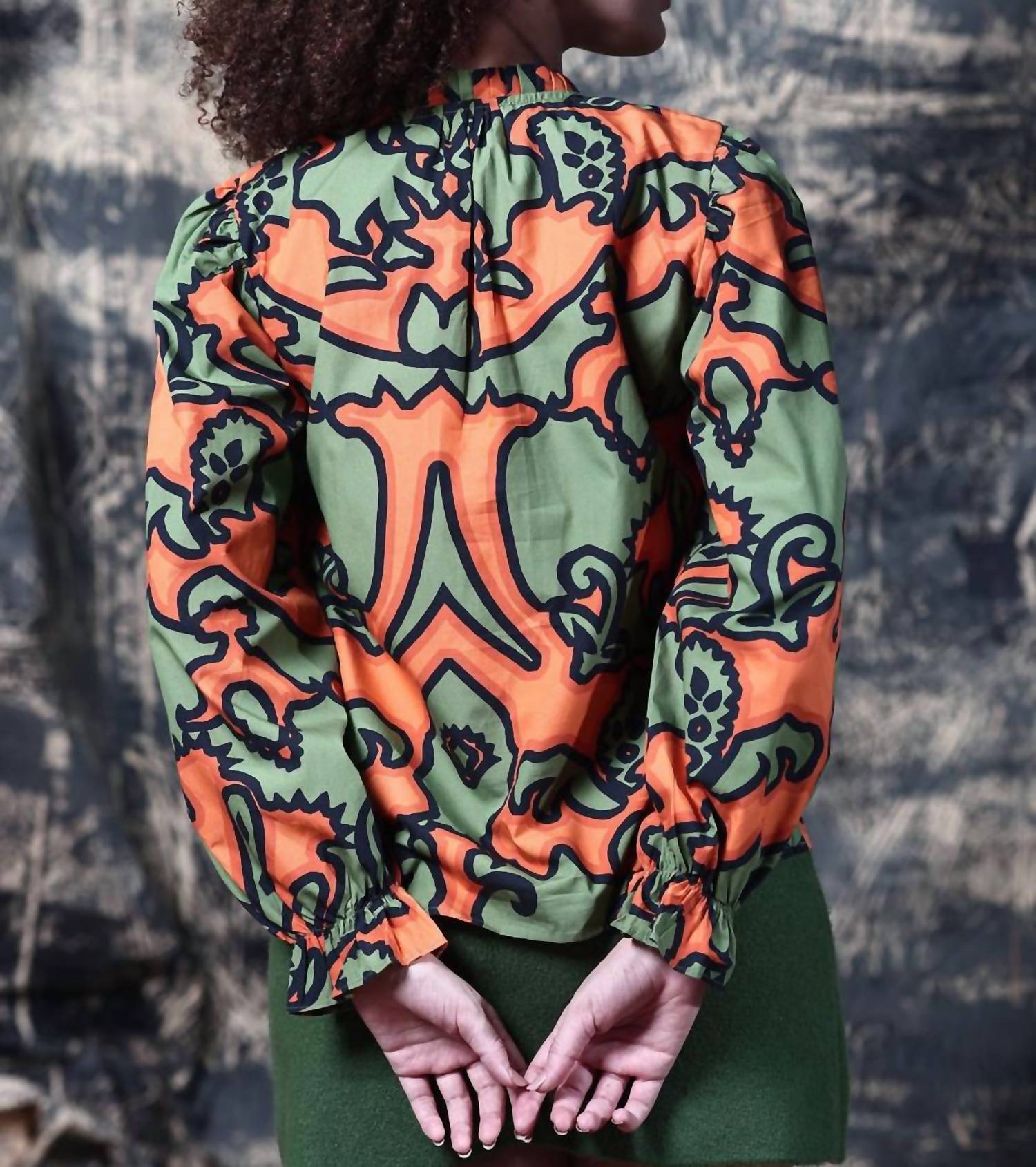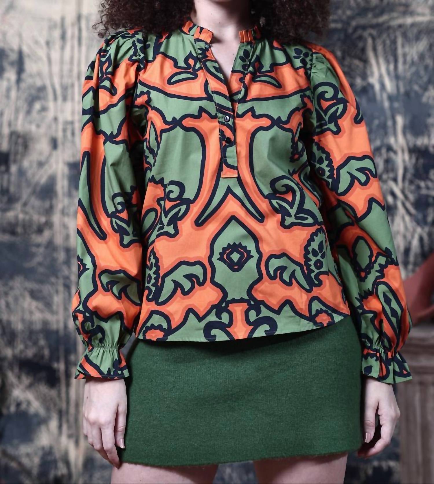 Meet the Ashley Top by Maude Vivante, an ornamental patterned blouse designed for women who embrace boho chic style. This long sleeve shirt is made from comfortable cotton and features a classic collar with a button closure. Perfect for spring, it adds festive flair to any Thanksgiving or holiday party ensemble. Care instructions are not available, offering seamless integration into any wardrobe.