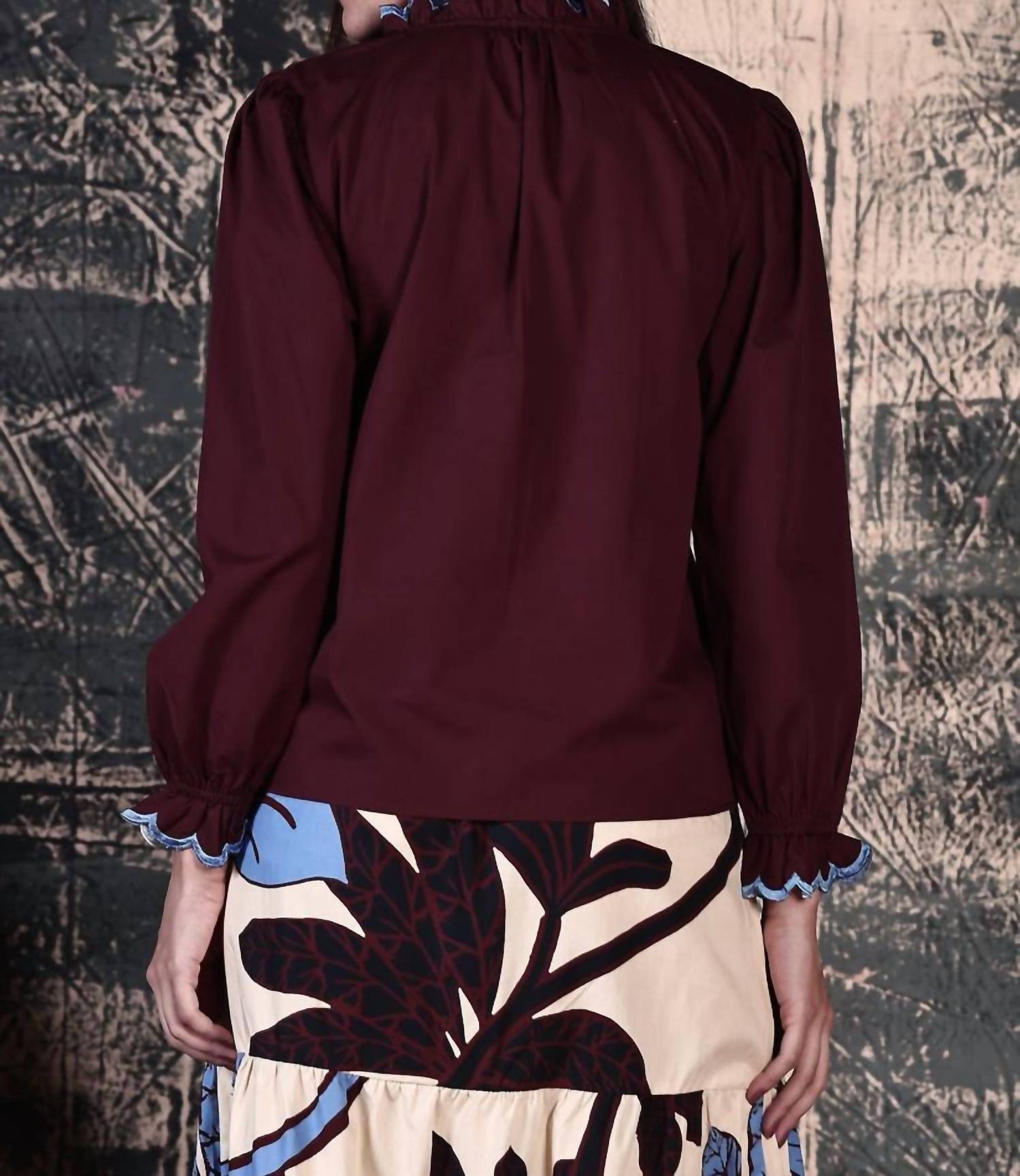 Experience understated elegance with the Avery Top by Maude Vivante, a beautiful choice for any occasion. This long sleeve blouse is expertly crafted from premium cotton, featuring a chic blue scalloped collar. Designed with a patterned aesthetic in a gentle chocolate hue and finished with a button closure, it is perfect for holiday parties or Thanksgiving gatherings. While specific care instructions aren't provided, this versatile piece is bound to become a favorite in your minimalist spring wardrobe.