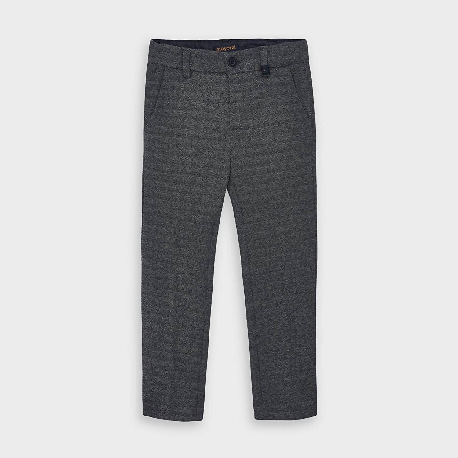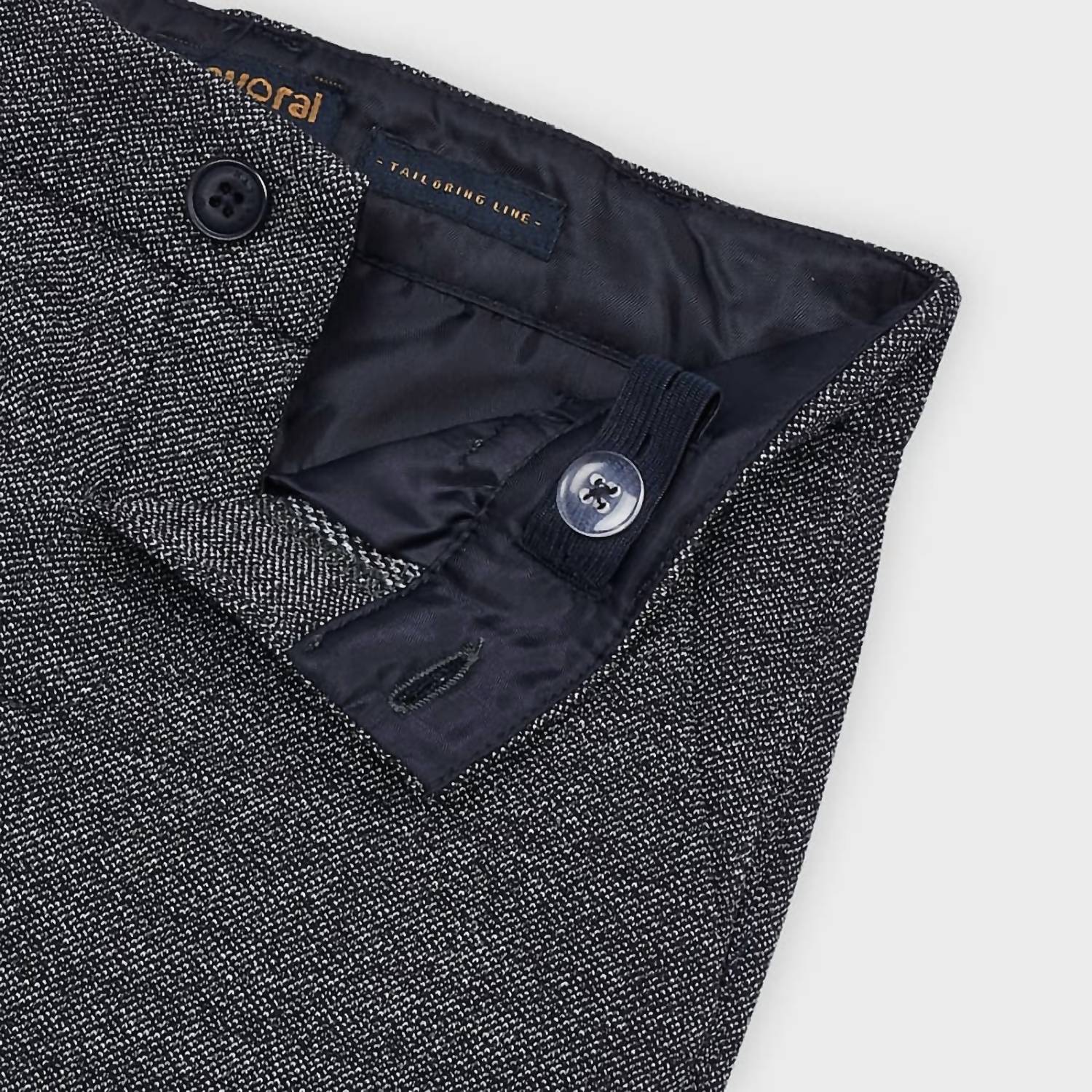 Introducing the Dressy Stretch Chino Pants by Mayoral, expertly crafted for boys with a sleek, solid Marine Melange design. These straight-cut pants combine the comfort of sweatpants with the tailoring of chinos, made from a cotton blend (53% Cotton, 47% Polyester). They feature belt loops, angled slit front pockets, and buttoned welt rear pockets, with a convenient button and zip closure for easy wearing. Care is simple with machine wash cold, no bleach, laying flat to dry, and using a cool iron—an ideal travel choice for the minimalist fall wardrobe.