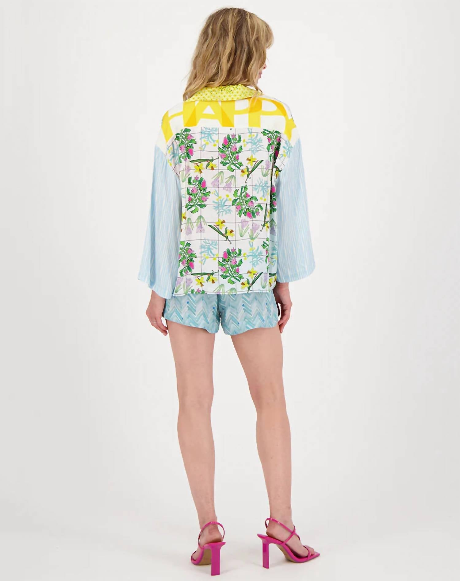 A classic button down shirt that will never go out of style. Elevate your summer style with the Nori Cropped Shirt by Me369, featuring long sleeves and a boho chic vibe. Crafted from 100% Viscose, this button-down shirt sports a unique Pura Vida floral pattern, complete with playful back messages reading "STAY GOLDEN" and "HAPPY." Its slightly wide sleeves and cropped cut create a breezy silhouette perfect for holiday parties. Care: Hand wash.