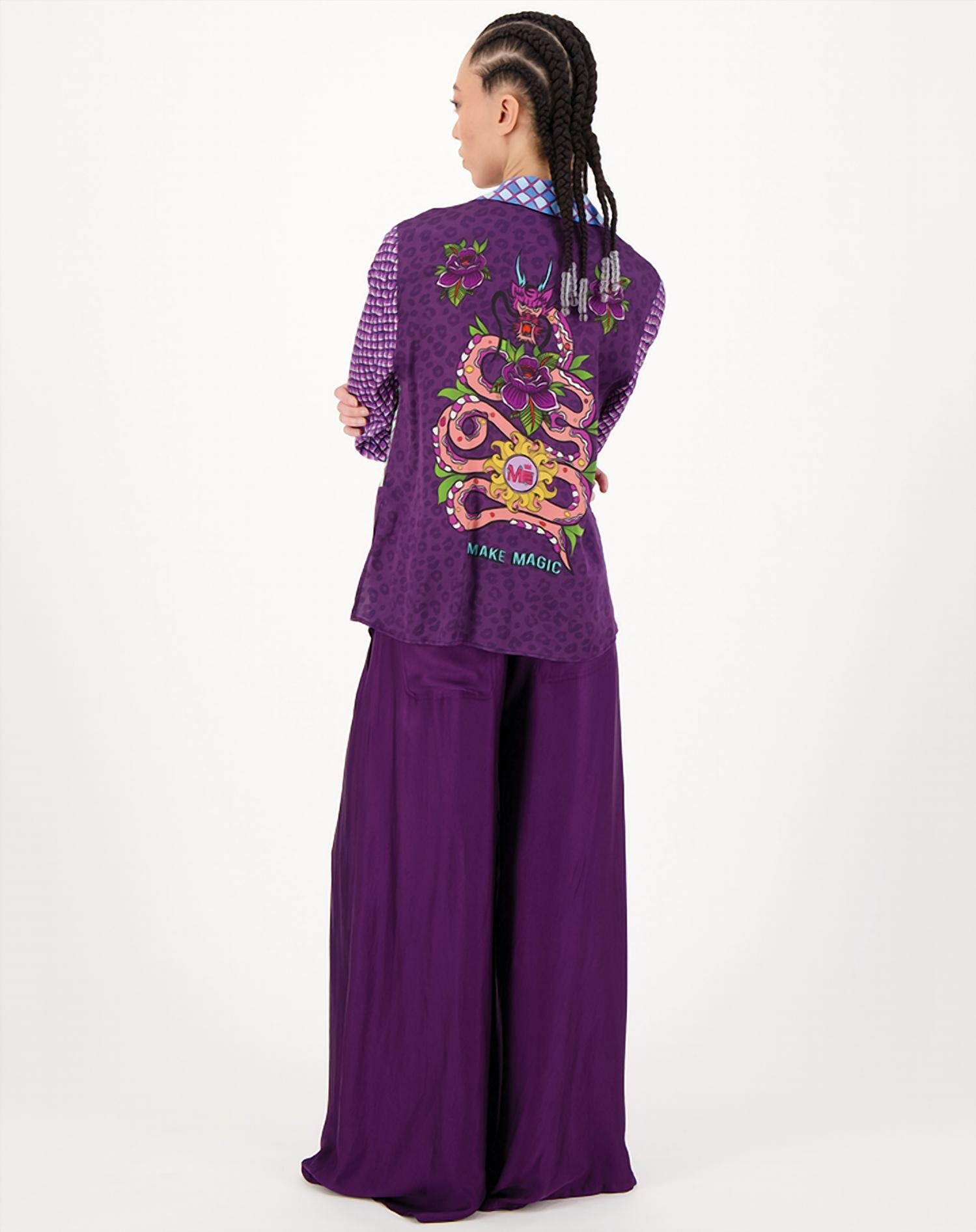 Perfectly tailored and soft to the touch. Introducing the Reyna Tie Waist Love Shirt by Me369, a statement piece in vibrant pink, purple, and green. This classic fit shirt features a button-down collar and long sleeves with a graphic print, exuding a Boho Chic vibe perfect for a summer holiday party. Crafted from 100% viscose, the shirt offers effortless elegance. Closure: Button closure.