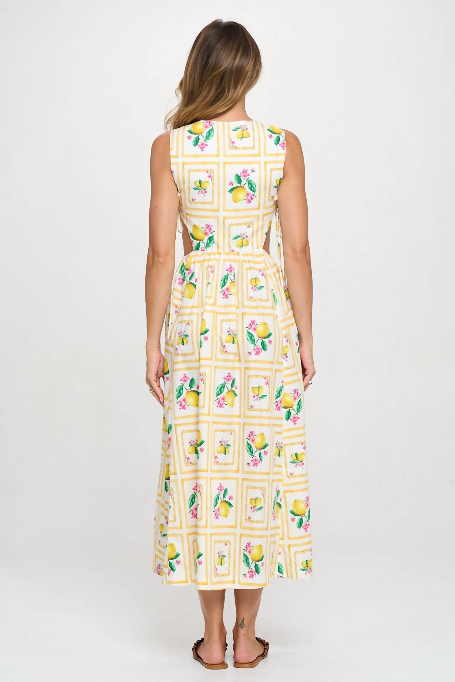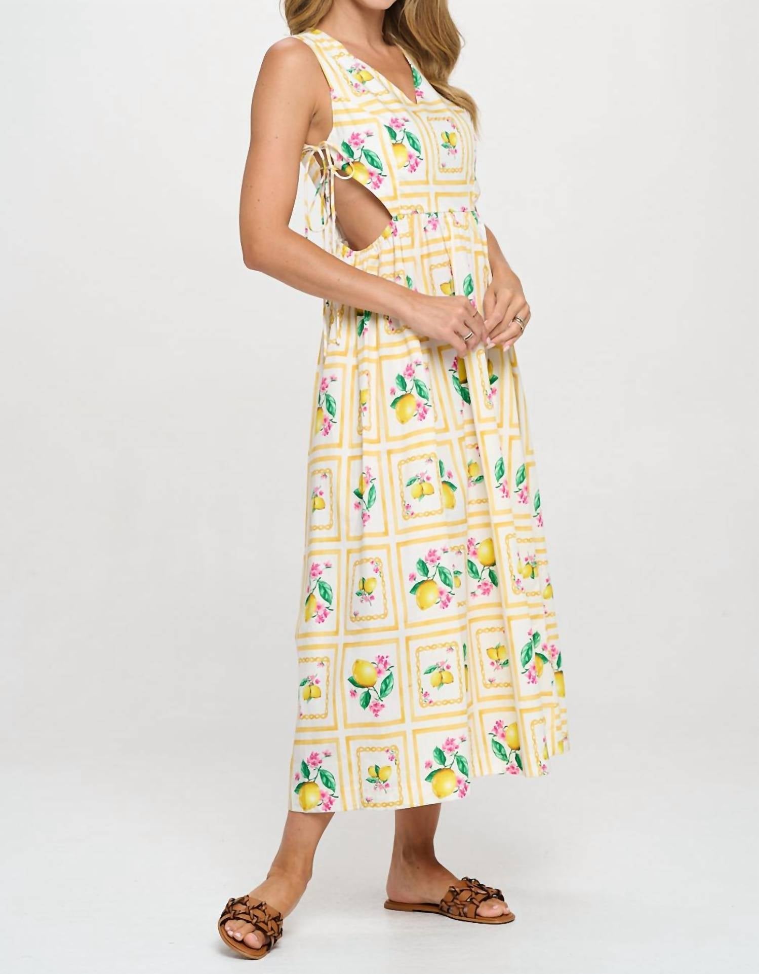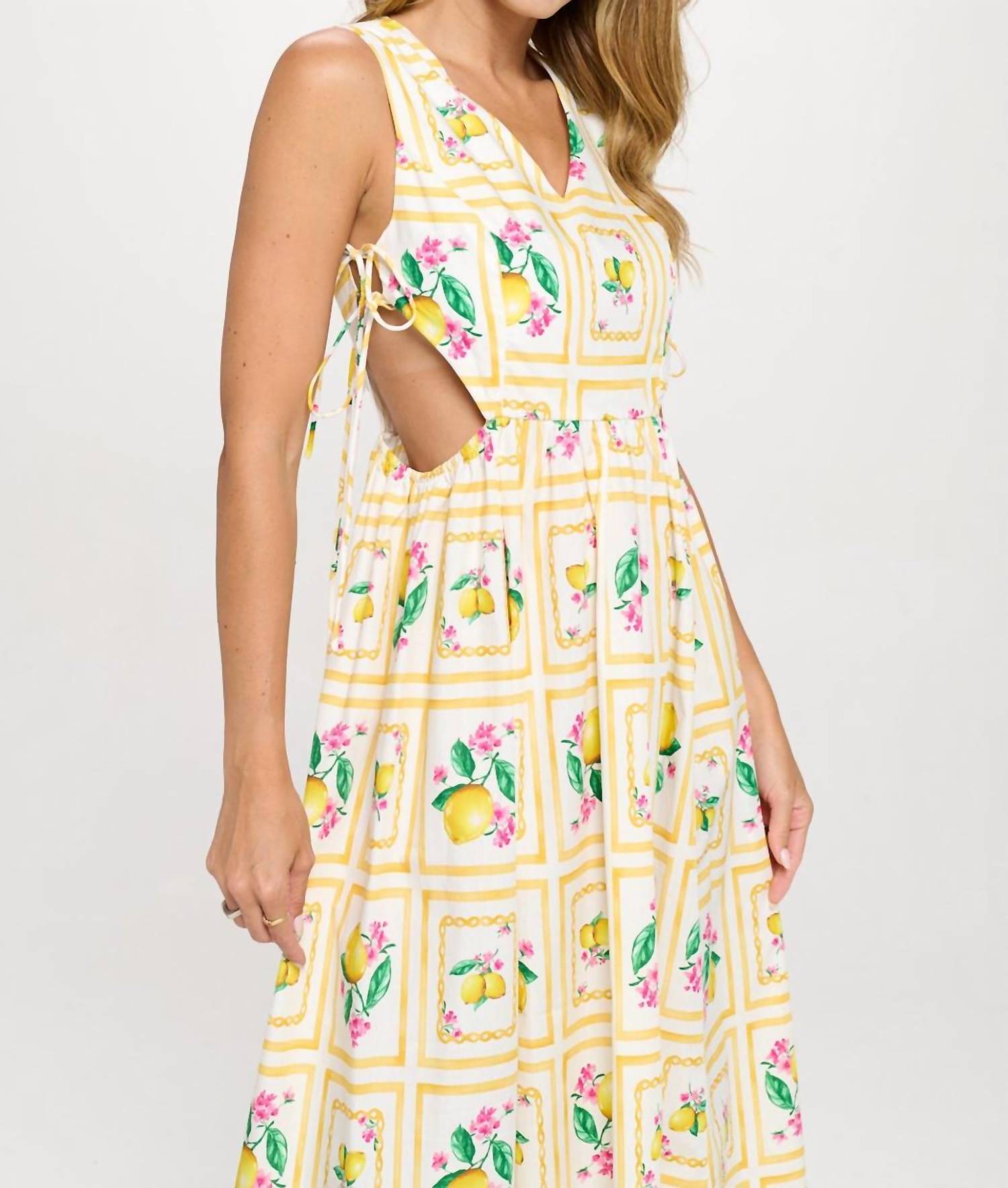 Who doesn't love a good maxi dress? This one you'll be reaching for season after season. Embrace the spirit of summer with the Meet Me in Santorini Citrus Maxi Dress in a vibrant yellow hue. This sleeveless A-line dress, designed for vacation occasions, features fun side cut-outs with ties and elastic for a playful touch. Made from 100% cotton with a 100% polyester lining, it offers breathable comfort for warm days, making it a perfect composition for your European getaway dreams. Closure: Tie closure. Care: Machine wash.