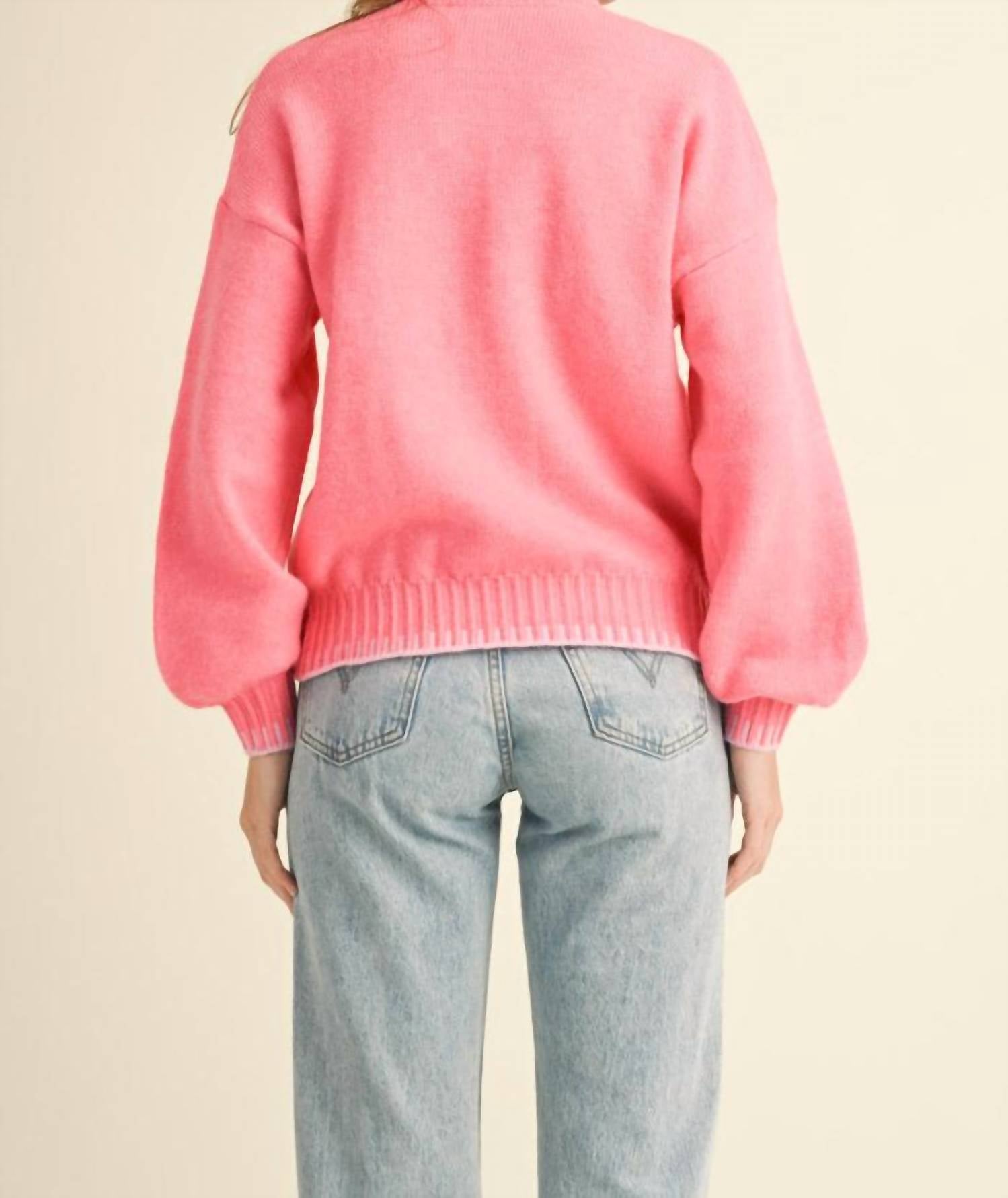 A classic staple that every closet needs. Introducing the Abigail Flower Detail Sweater by &merci, an elegant choice for fall with its charming flamingo pink hue. This sweater features long sleeves, a scalloped mock neck, and floral embroidery, perfect for adding a feminine touch to your travel wardrobe. Crafted from a blend of 42% acrylic, 30% polyester, and 28% nylon, and designed with a relaxed fit, the garment measures 24.5" in length for size M. Closure: Pull on. Care: Hand wash. Available in various sizes—Bust: S 44", M 46", L 48".
