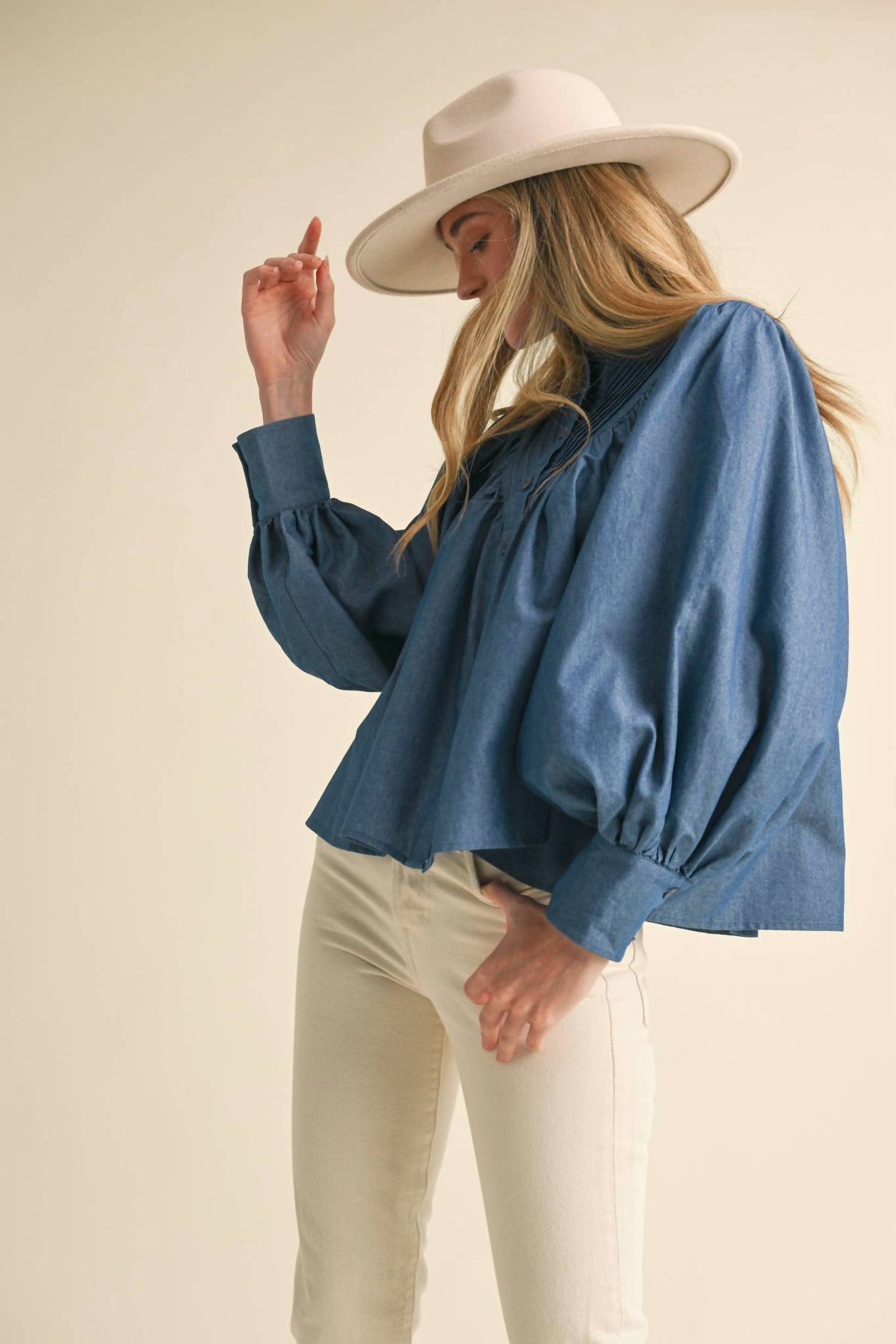 A classic button down shirt that will never go out of style. Elevate your wardrobe with the &merci Button Down Batwing Sleeve Top in Blue Denim, designed for fall's holiday parties. This top showcases long batwing sleeves with buttoned cuffs and a classic stand collar neckline, perfect for a stylish and relaxed fit. Crafted from textured denim, it features eye-catching pintuck detail on the front and back yoke as well as on the sleeve cuffs. Closure: Button closure. Model wears size S and is 5'8" with measurements 32-24-33.
