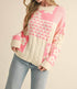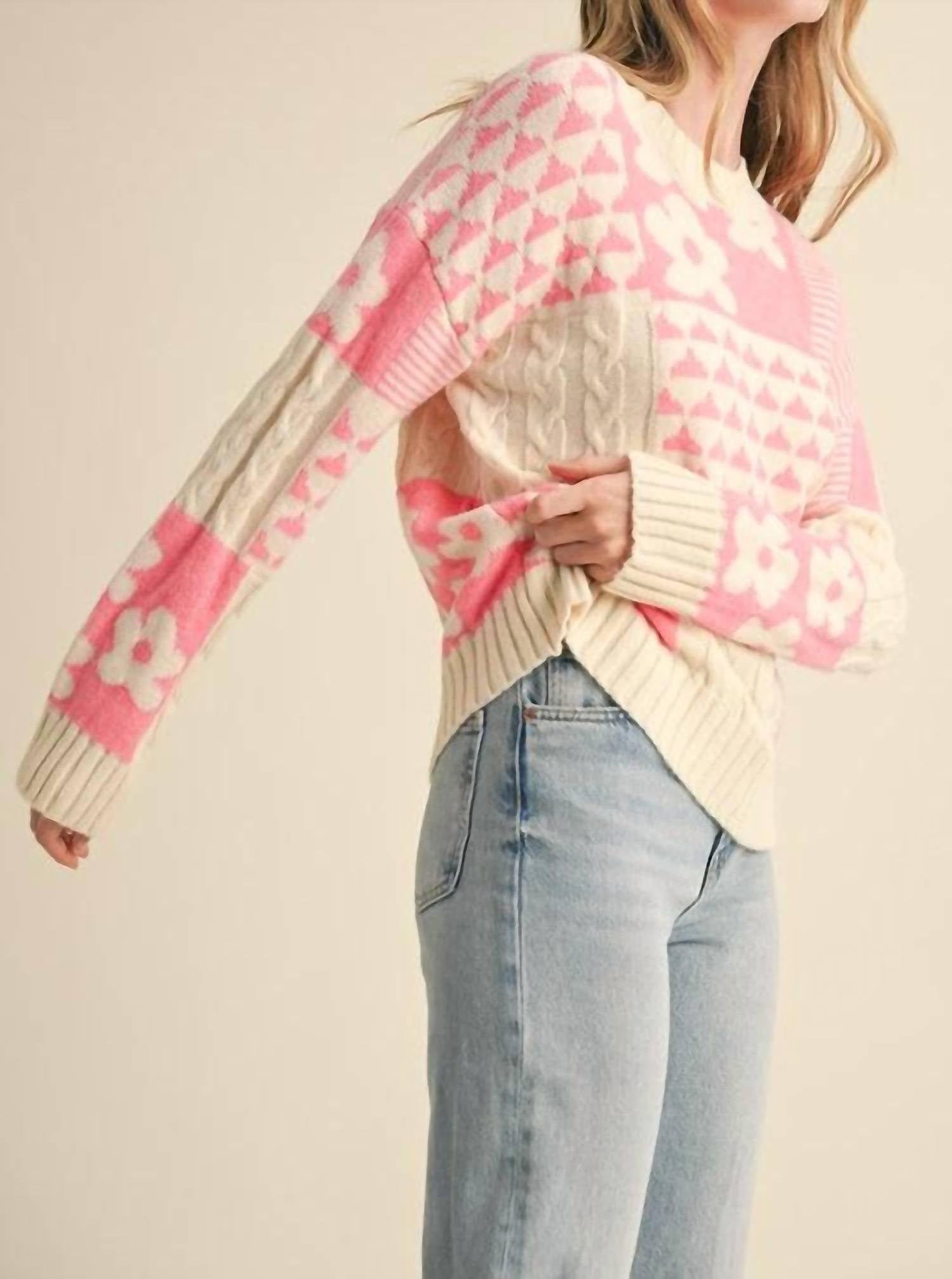 This slightly oversized sweater showcases long drop shoulder sleeves and a ribbed crewneck that exudes casual elegance. The pullover design features a unique mix of floral, geometric, and cable knit patterns. Perfectly crafted for both style and comfort, this sweater is a must-have for every fashion-forward collection.