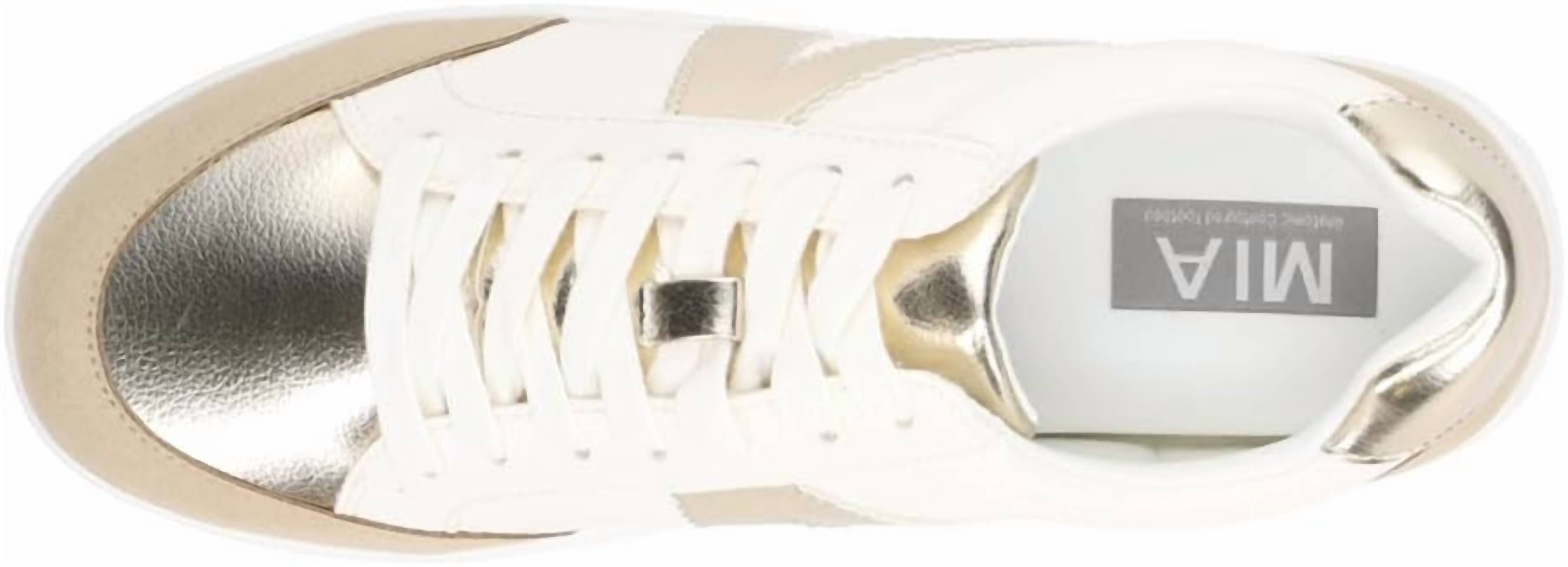 Quando moda e funcionalidade se unem perfeitamente. Eleve seu estilo com o Tênis MIA Astra, uma opção divertida e sofisticada em uma elegante combinação de branco e dourado. Confeccionado em couro de alta qualidade, este tênis oferece um toque luxuoso, além de durabilidade e conforto. O design conta com bico arredondado, perfeito para quem busca estilo e praticidade em seus calçados. Seja para um passeio casual ou para fazer compras, este tênis combina moda com praticidade no dia a dia sem esforço.