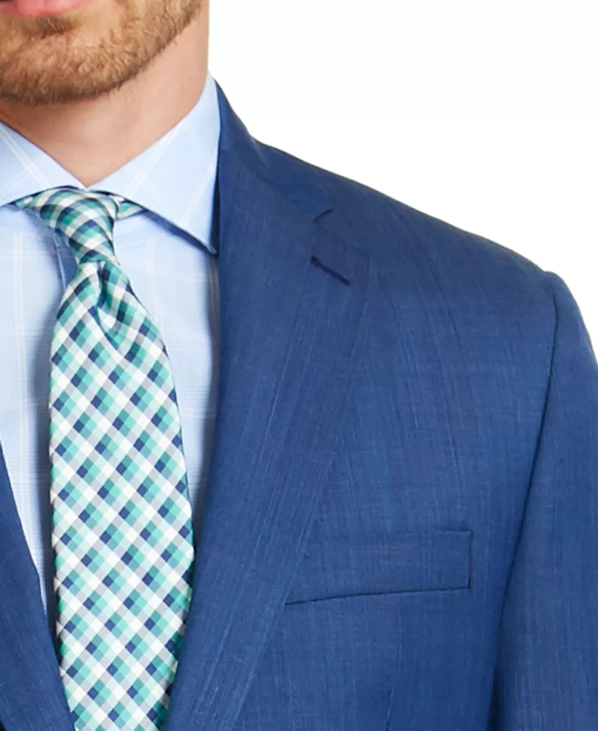 Colete e calças combinando vendidos separadamente | Fecho de dois botões; punhos de quatro botões | Lapela entalhada | Aberturas laterais; totalmente forrado; tecido de pele de tubarão; desempenho elástico | Dois bolsos frontais com aba; bolso embutido no peito esquerdo; bolso interno | Importado