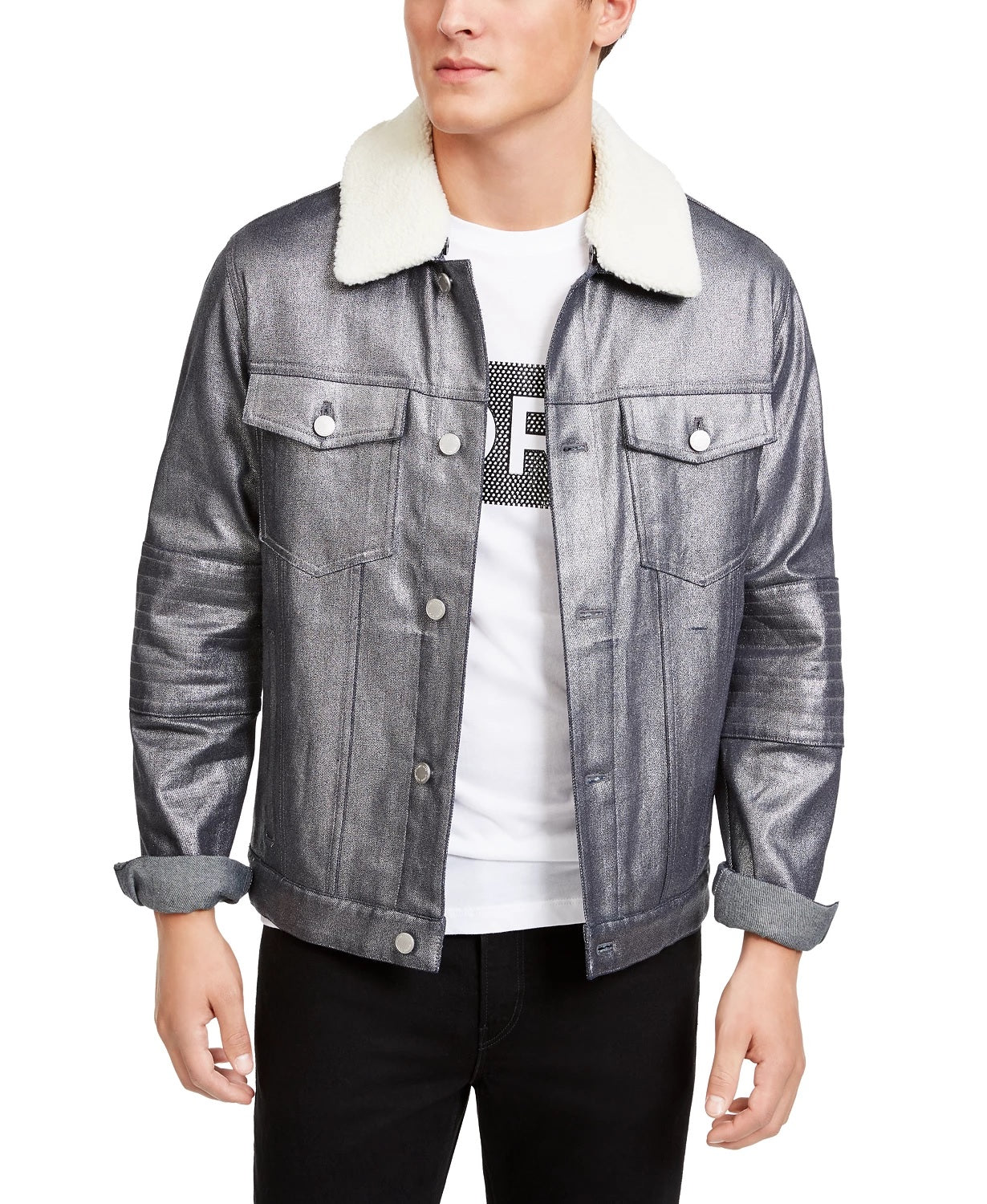 Jaqueta Motociclista Masculina Michael Kors Prata Metálica Denim Gola de Carneiro Tamanho Grande