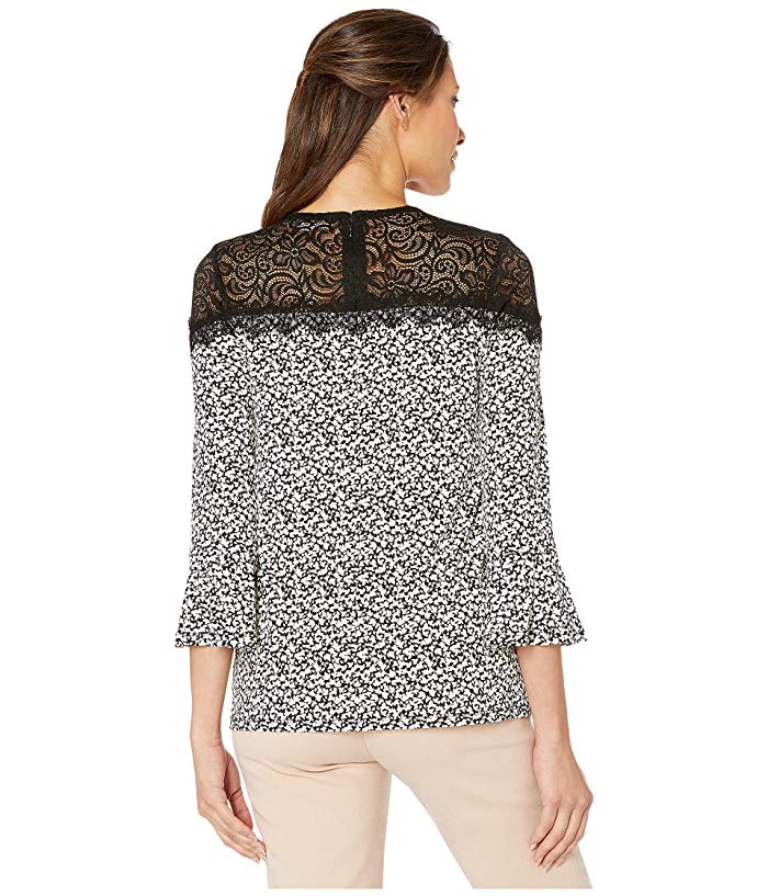 Este top sedutor vai te deixar linda a estação toda! Blusa elegante com caimento solto | Tecido estampado em poliéster e elastano com detalhe de renda transparente nos encaixes | Decote redondo e mangas três quartos com punhos alargados | Fecho de zíper nas costas | Barra reta até o quadril | 95% poliéster | 5% elastano
