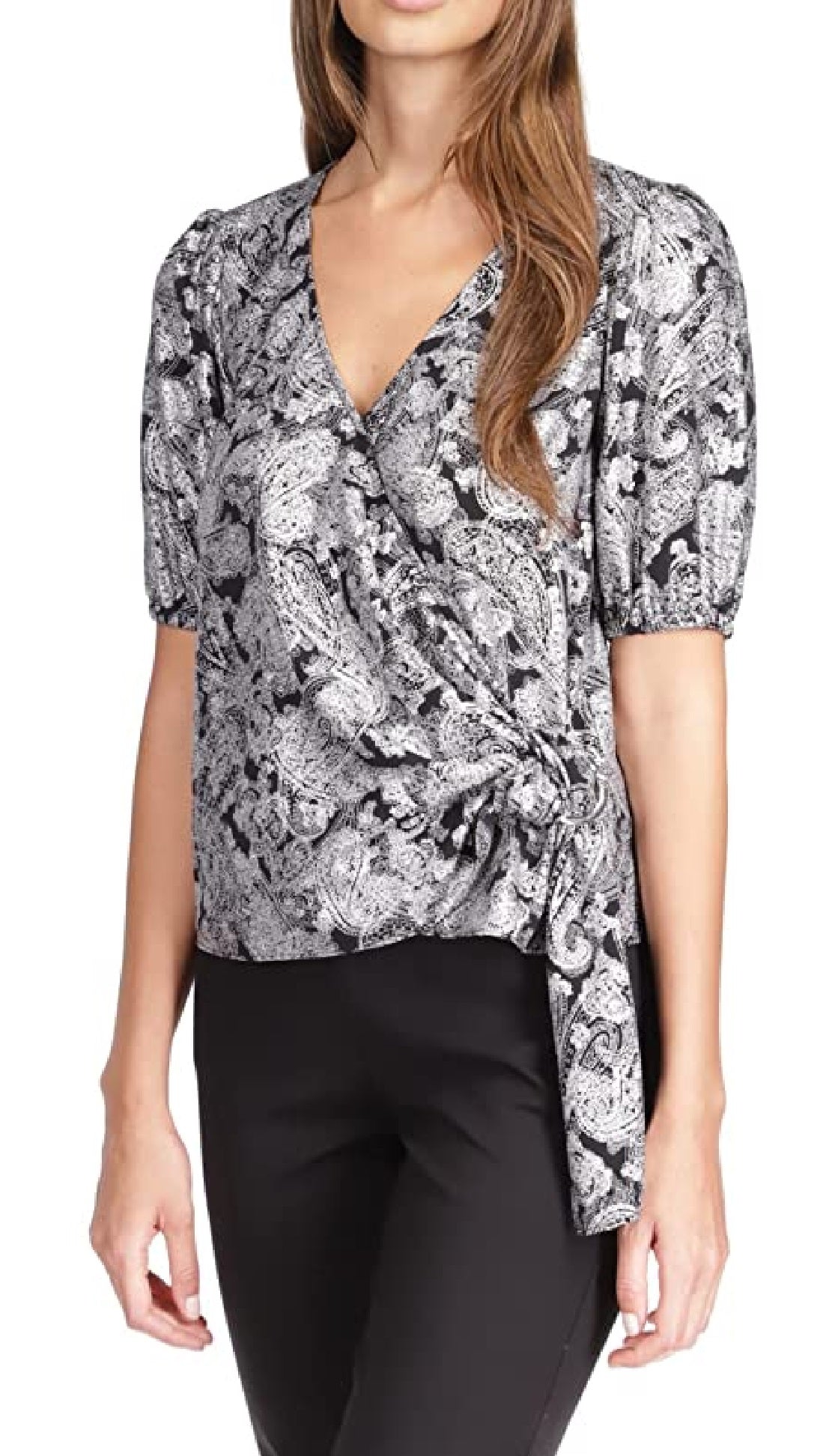 Deslumbrante com estampa paisley metálica | este top envolvente Michael Kors é feito de crepe leve para um caimento elegante. | Aproximadamente 23 de comprimento | Decote sobrepeliz; fecho de amarrar no quadril esquerdo | Poliéster/elastano | Lavagem a seco