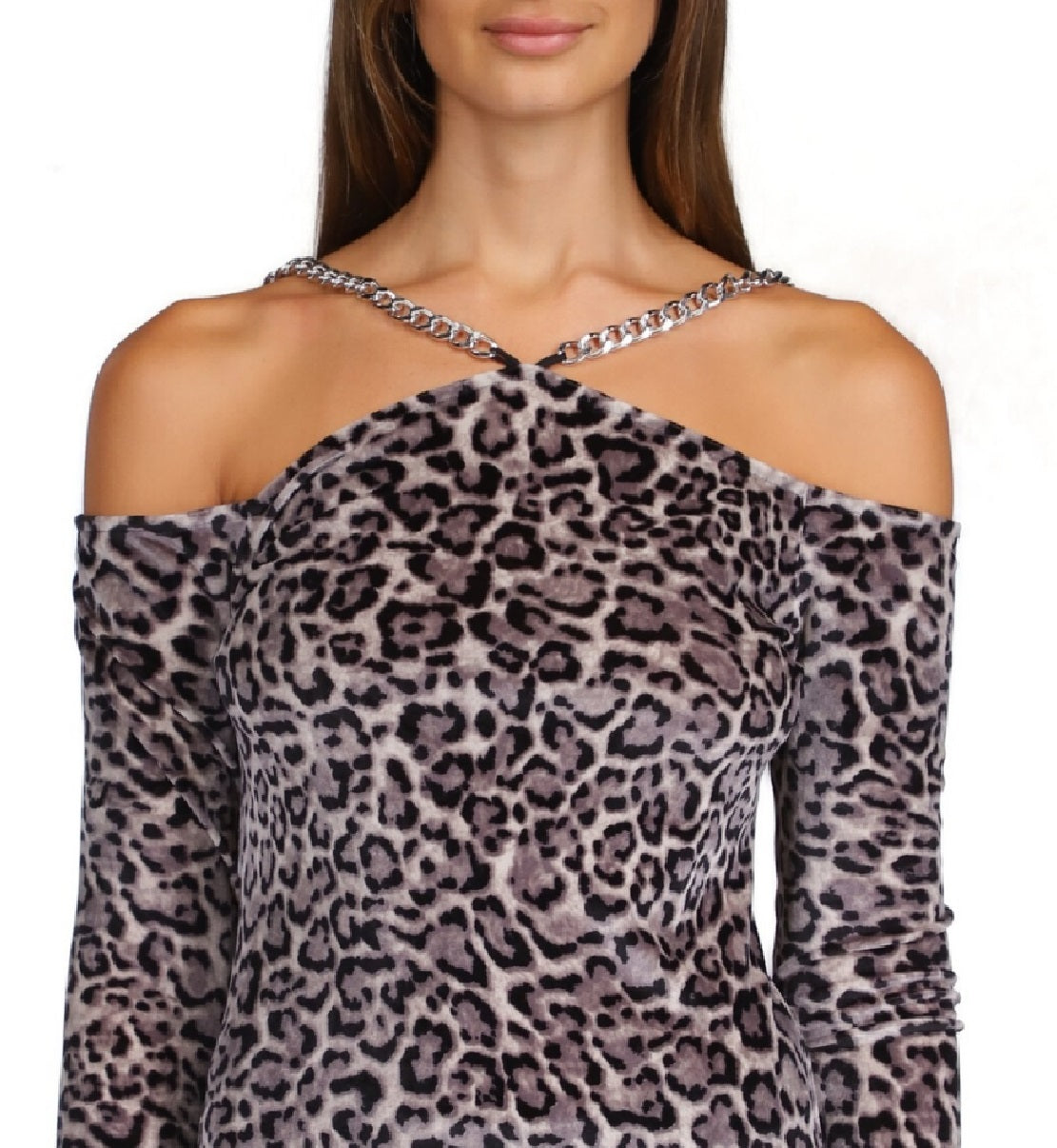 Moderno e ousado | Este top Michael Kors com ombros descobertos é feito de veludo felpudo com estampa de gato | Um decote em corrente finaliza o visual moderno |