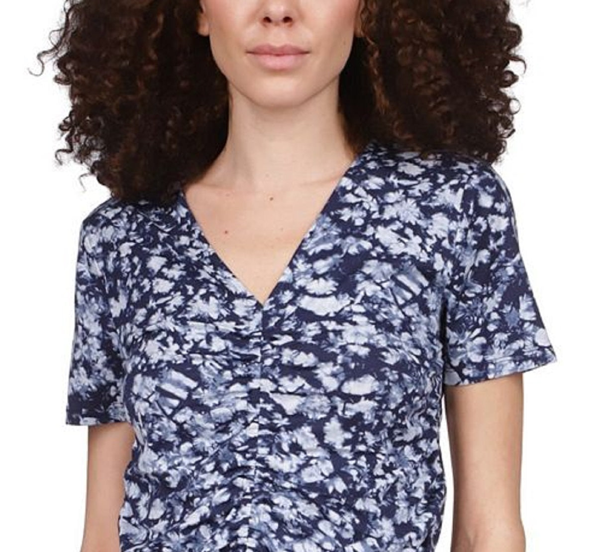 Deixe a camiseta de lado e aposte no estilo elegante desta blusa de malha da Michael Kors. Um cordão franzido realça a divertida estampa tie-dye. | Comprimento aproximado de 61 cm (Regular) a 56 cm (Pequena) | Desenhada para se ajustar e valorizar pessoas de 1,62 m ou menos | Franzido e cordão na frente | Algodão/modal | Lavável à máquina | Importado