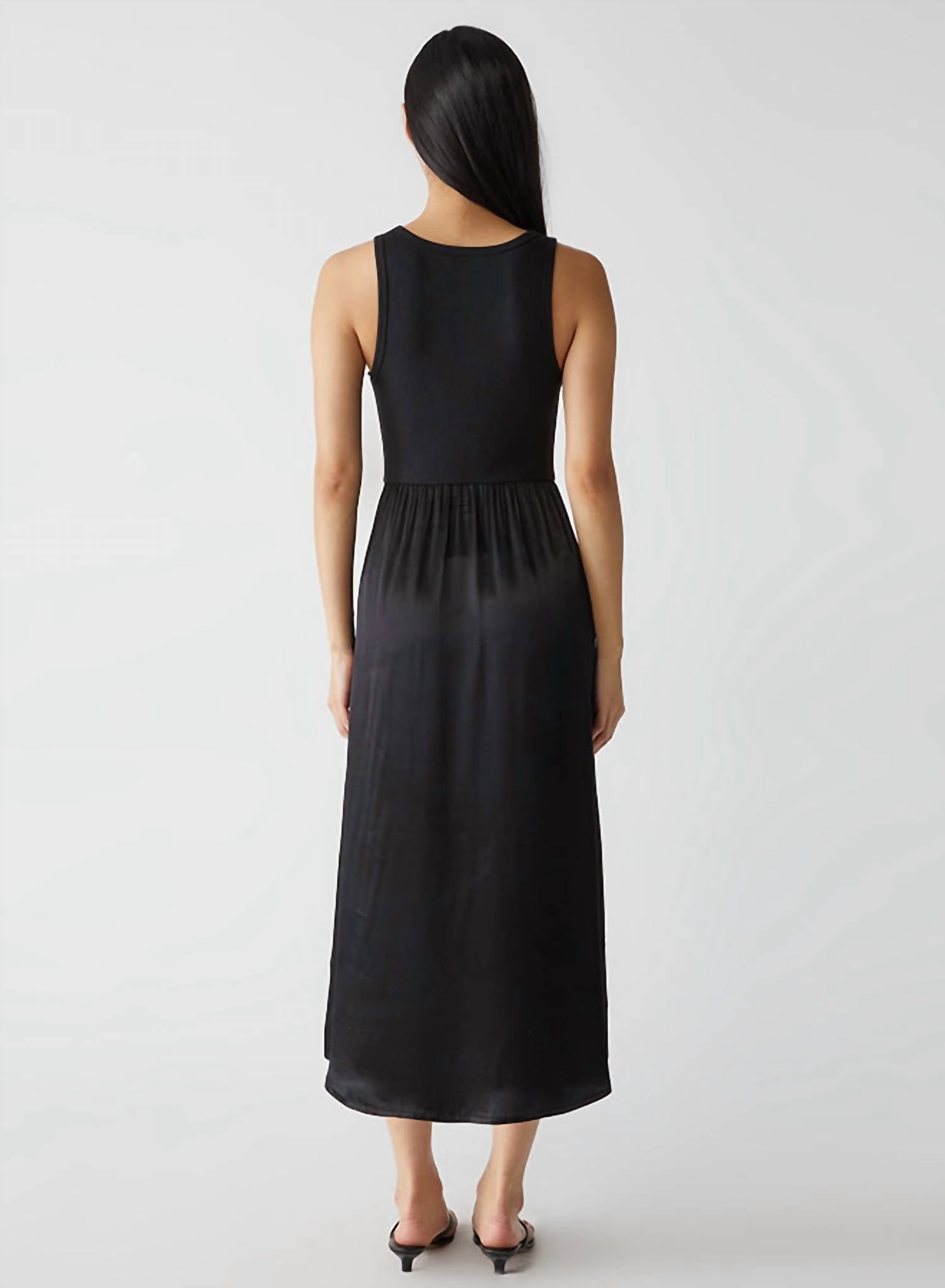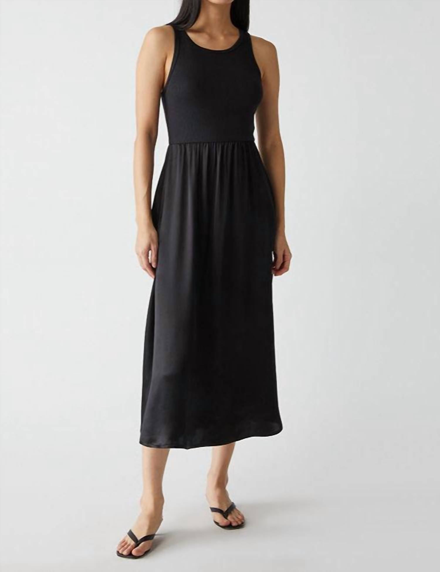 Just add slides or mules and you are good to go. Step into elegance with the Bridgette Mixed Fabric Midi Dress by Michael Stars, an essential for your summer wardrobe. This chic midi dress comes in solid black and features a sleeveless, scoopneck design for a polished silhouette. The shift dress is crafted from mixed fabrics, combining a ribbed bodice with a sleek satin skirt, and offers pull-on ease for seamless wear. Care for this versatile piece is simple with machine wash and tumble dry instructions.
