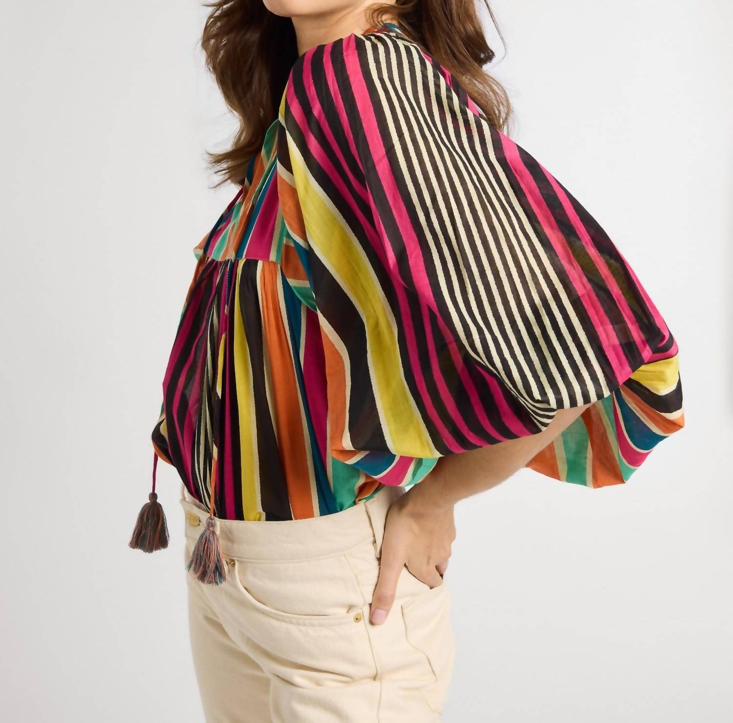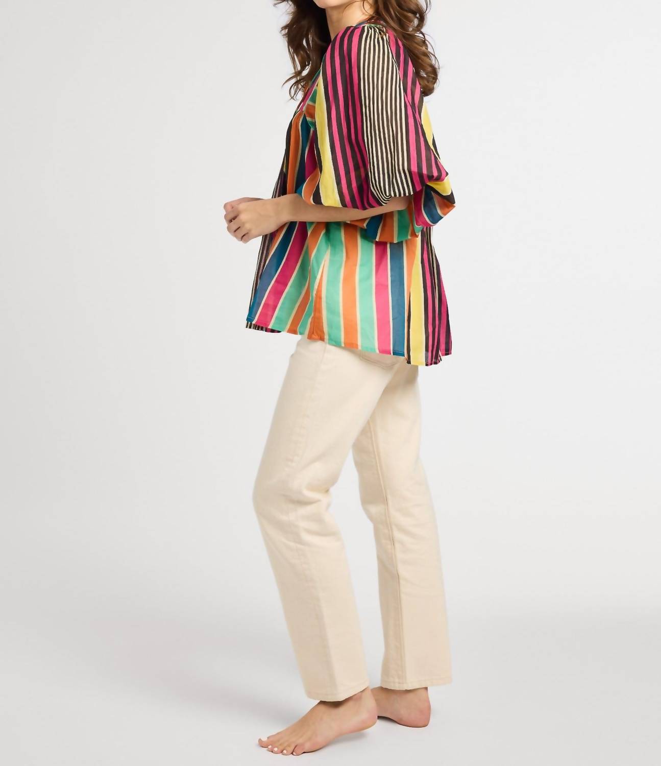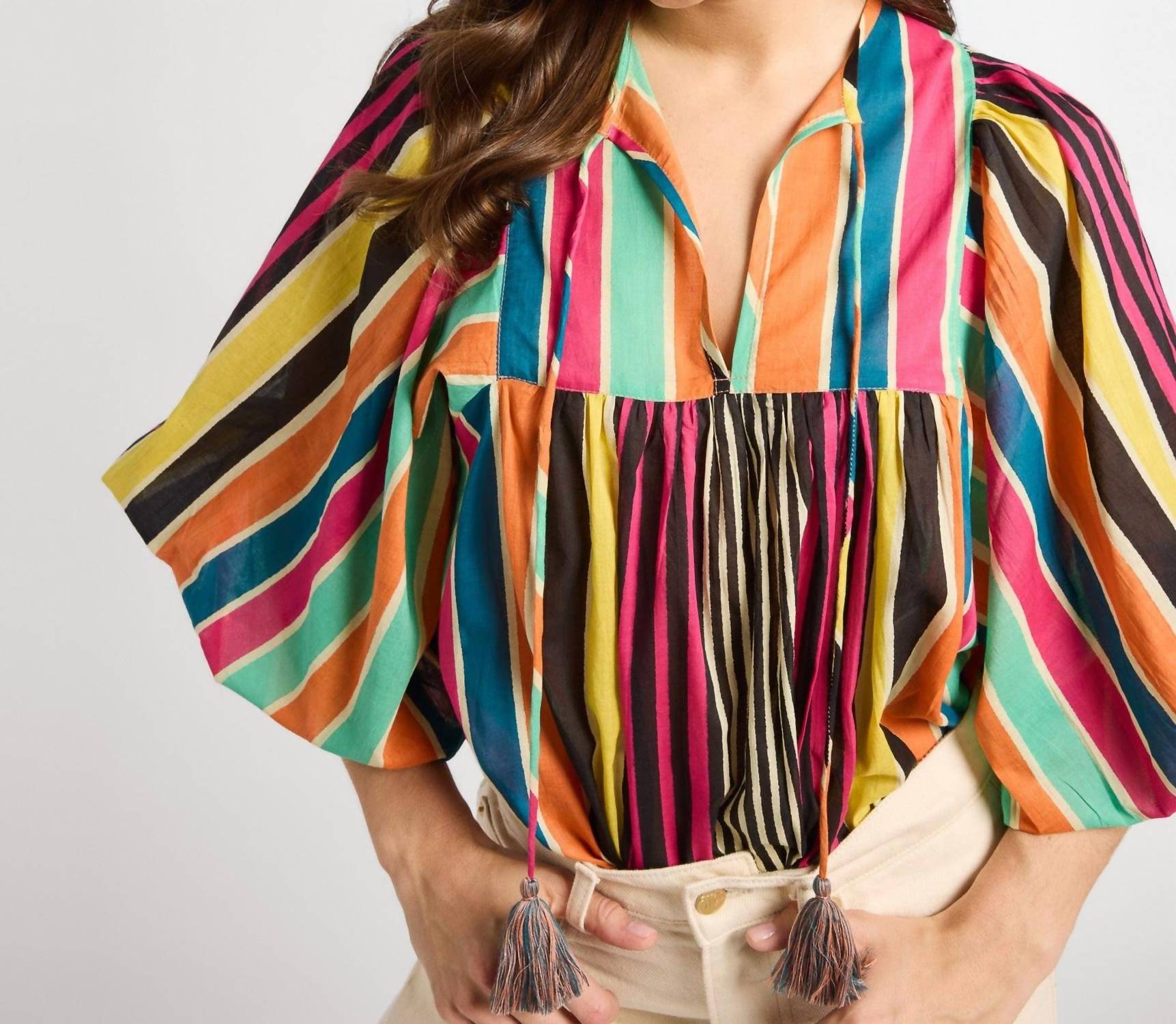 Descubra o Charlie Top da MILLE, uma peça estilosa para mulheres com a alegre estampa listrada Ibiza. Com mangas curtas e um decote em V charmoso, esta blusa é confeccionada em algodão para maior conforto e respirabilidade. Aproveite a praticidade do fecho pull-on para um uso sem esforço. As instruções de cuidado incluem lavagem somente à mão para maior durabilidade.