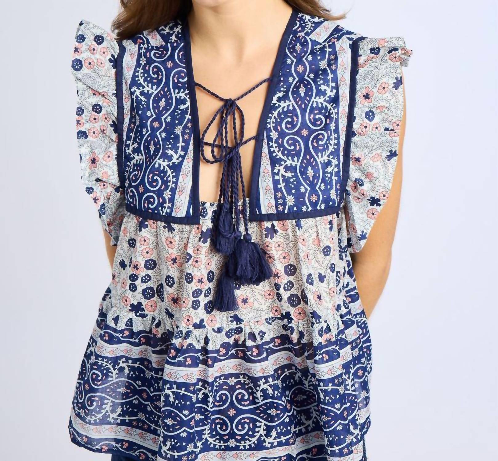 Combine isso com seus jeans e chinelos favoritos para sua próxima noite entre amigas. Descubra a Blusa Chelsea Floral da MILLE, uma charmosa peça azul-marinho criada para oferecer estilo e conforto. Esta blusa feminina apresenta mangas curtas e um decote em V estreito, com detalhes em borlas e babados plissados ​​para um toque encantador. Confeccionada em 100% algodão, com um corte levemente cropped e rodado, ela se adapta a todos os tipos de corpo e é perfeita para dias quentes e ensolarados. Fechamento: com amarração. Os tamanhos disponíveis variam de XS (53 cm de comprimento, 102 cm de busto) a GG (63 cm de comprimento, 122 cm de busto).