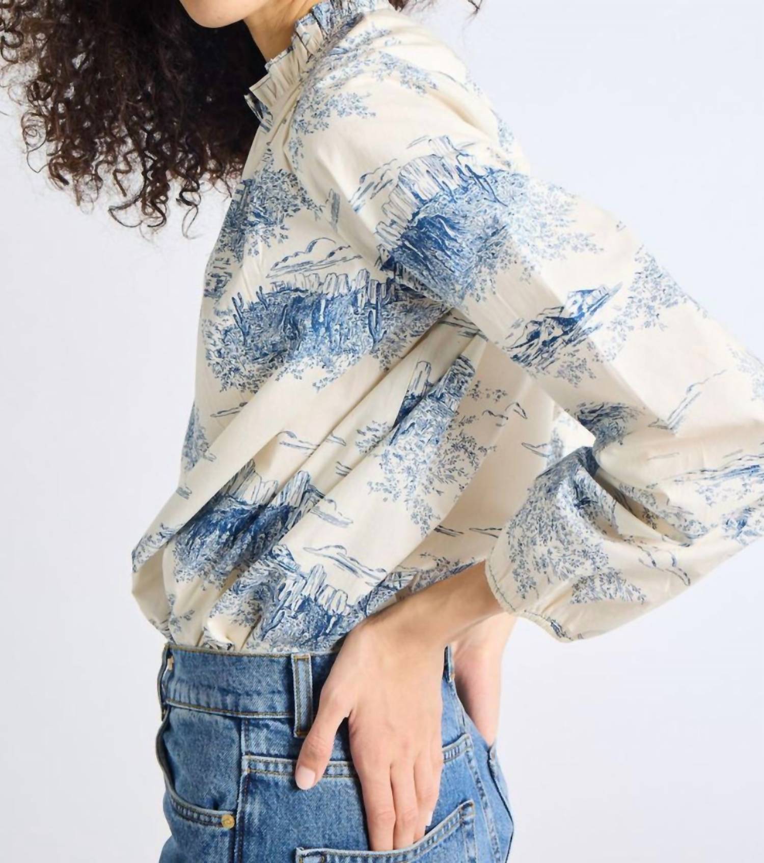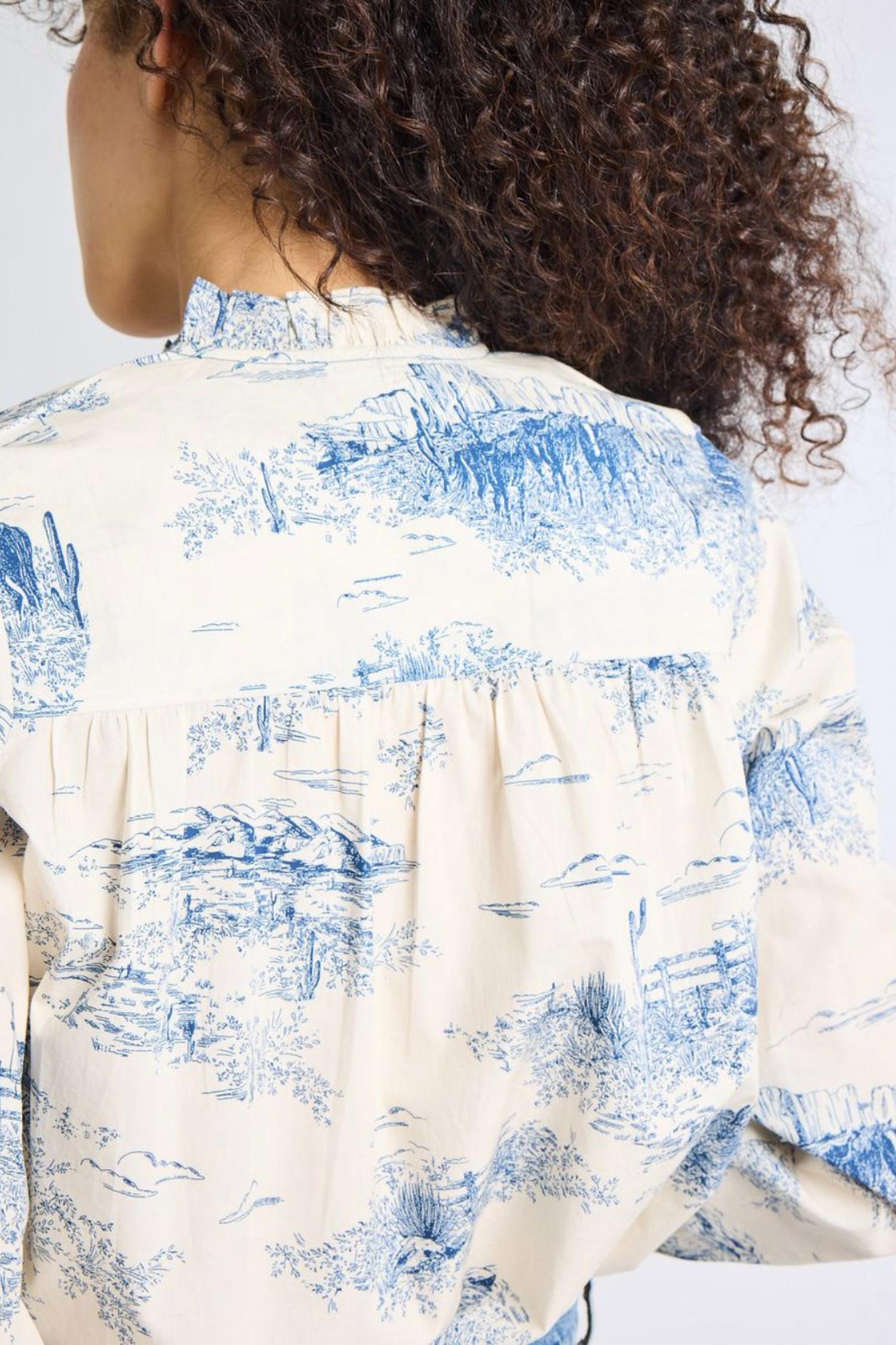 Introducing the Francesca Cotton Top by MILLE, an elegant choice in Western Toile perfect for summer occasions. This women's blouse features a mockneck with delicate ruffle details and long sleeves, offering a maximalist flair. Made from 100% Cotton, it boasts a voluminous body ideal for tucking, complete with a button closure. To maintain its vibrant patterned design, it requires dry cleaning.