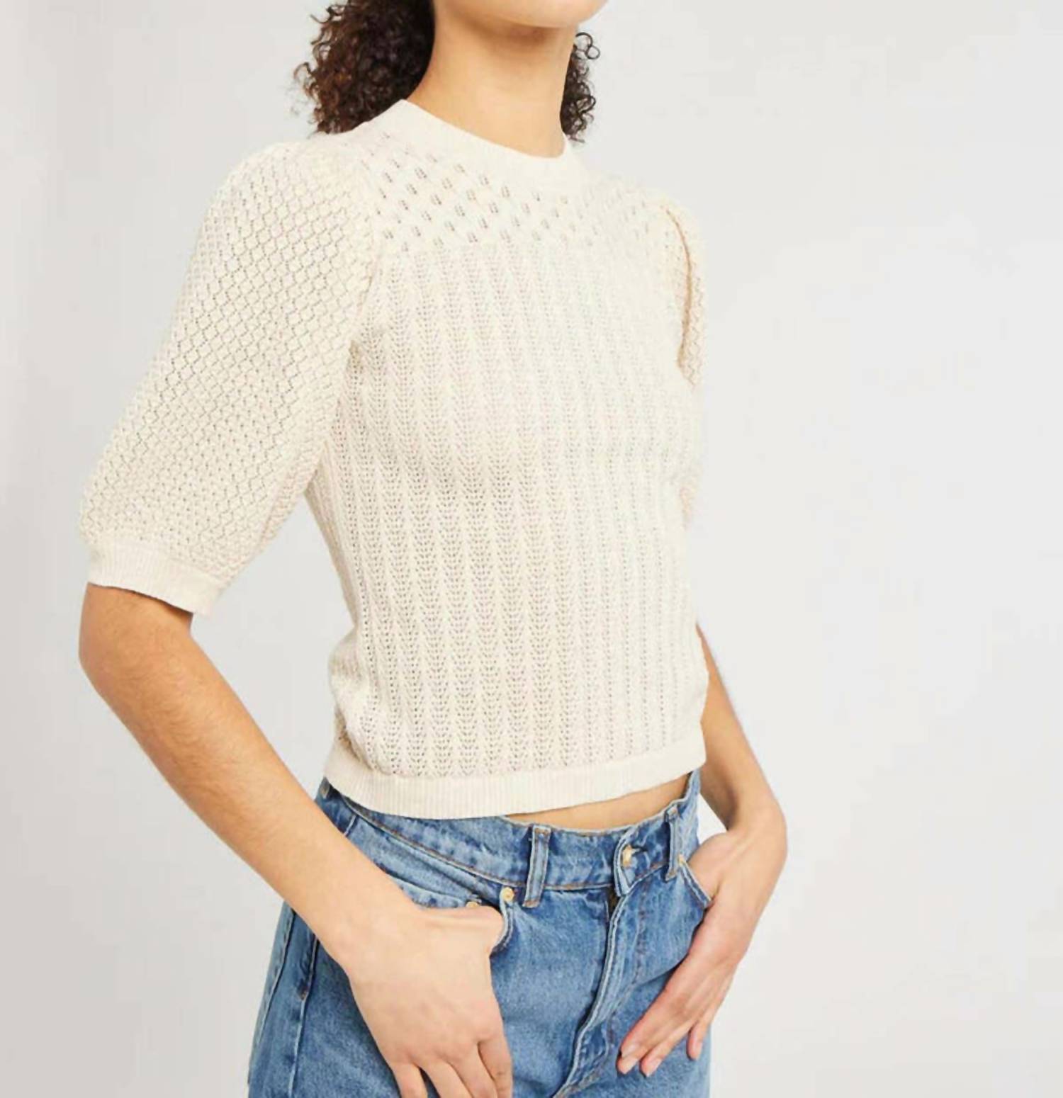 Um tricô queridinho para adicionar à sua coleção de outono. Esta blusa de meia manga tem decote redondo, detalhes em crochê à mão e manga bufante com volume na medida certa.