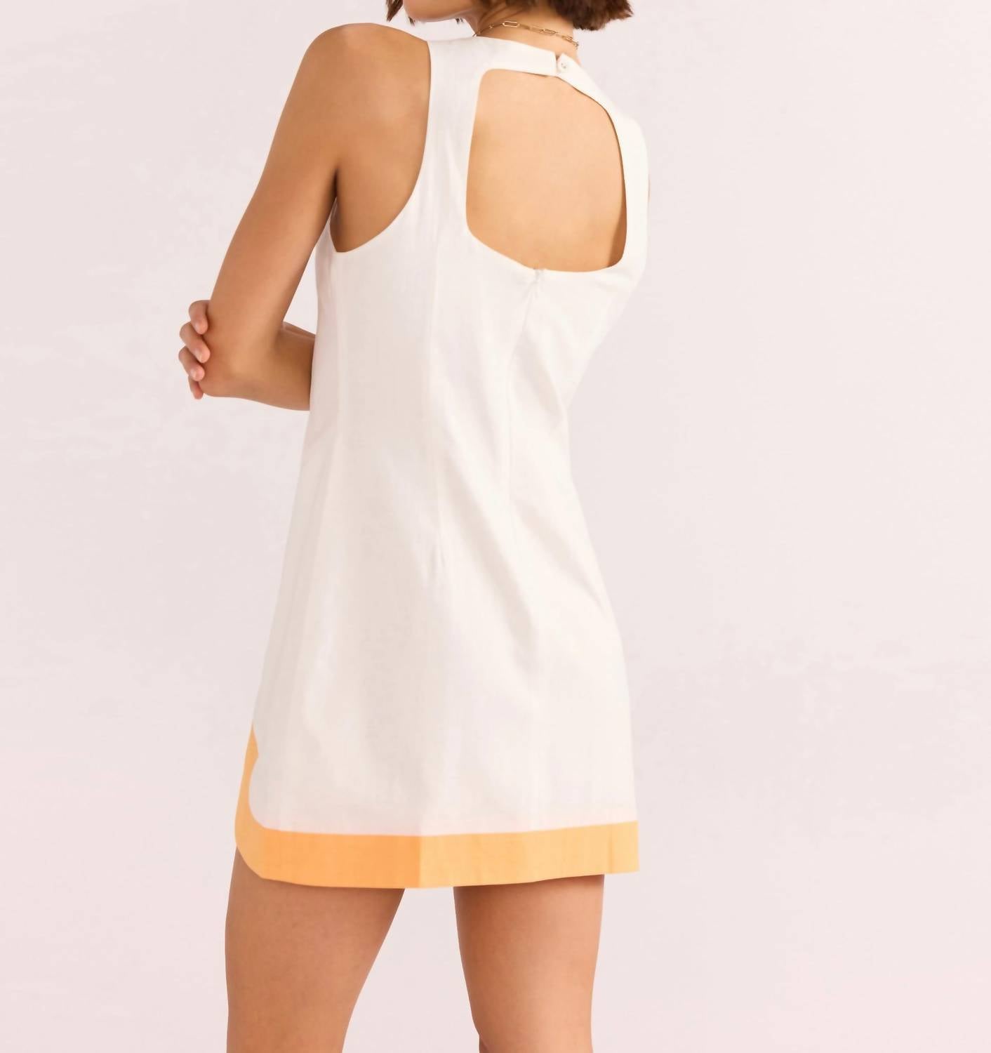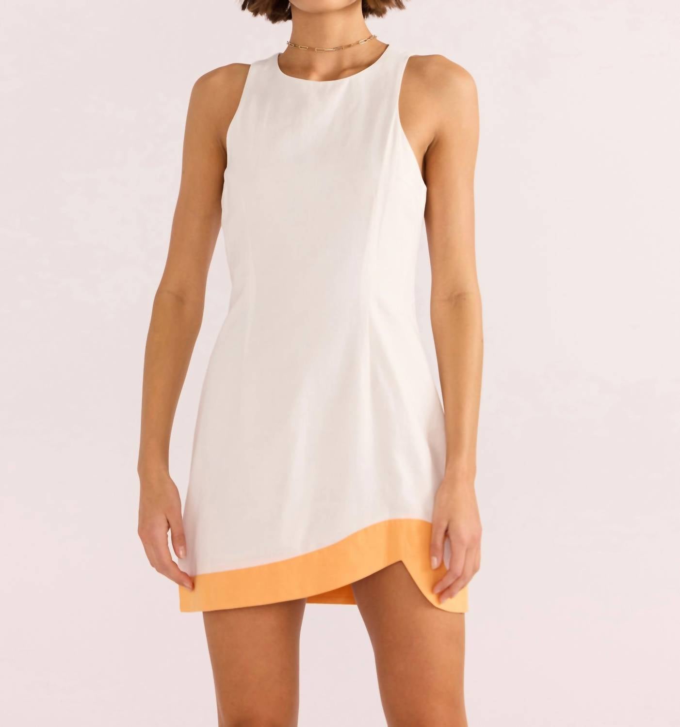 Aproveite os dias quentes com estilo com o Mini Vestido MINKPINK Alora Wave, uma mistura cativante de tons de branco e laranja. Este minivestido sem mangas apresenta uma estampa sólida e gola redonda, perfeito para um look moderno com um charmoso detalhe aberto nas costas. Projetado para ser prático, ele vem com um fecho de puxar. As instruções de cuidado incluem lavagem à mão e secagem no varal para manter seu estilo vibrante.