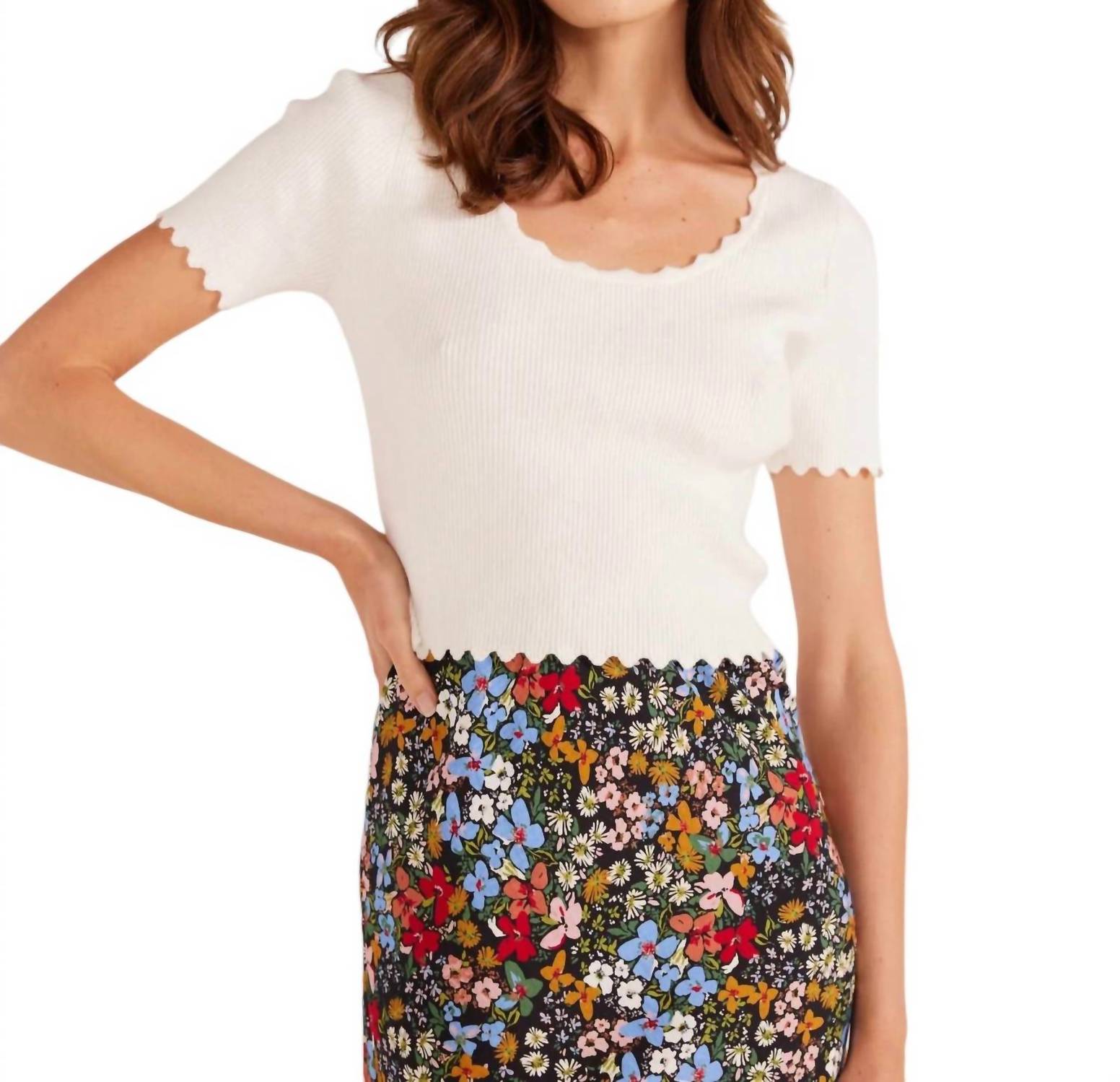 Mostre um pouco de pele com este top curto fofo e casual. Abrace a elegância da camiseta de malha MINKPINK Laura Scallop em um tom marfim atemporal. Confeccionada em acrílico, esta camiseta de malha texturizada possui mangas curtas e decote redondo com delicados detalhes em vieira. Seu fecho pull-on facilita o vestir, enquanto o material canelado adiciona um toque de sofisticação. Perfeita para adicionar um toque chique a qualquer look.