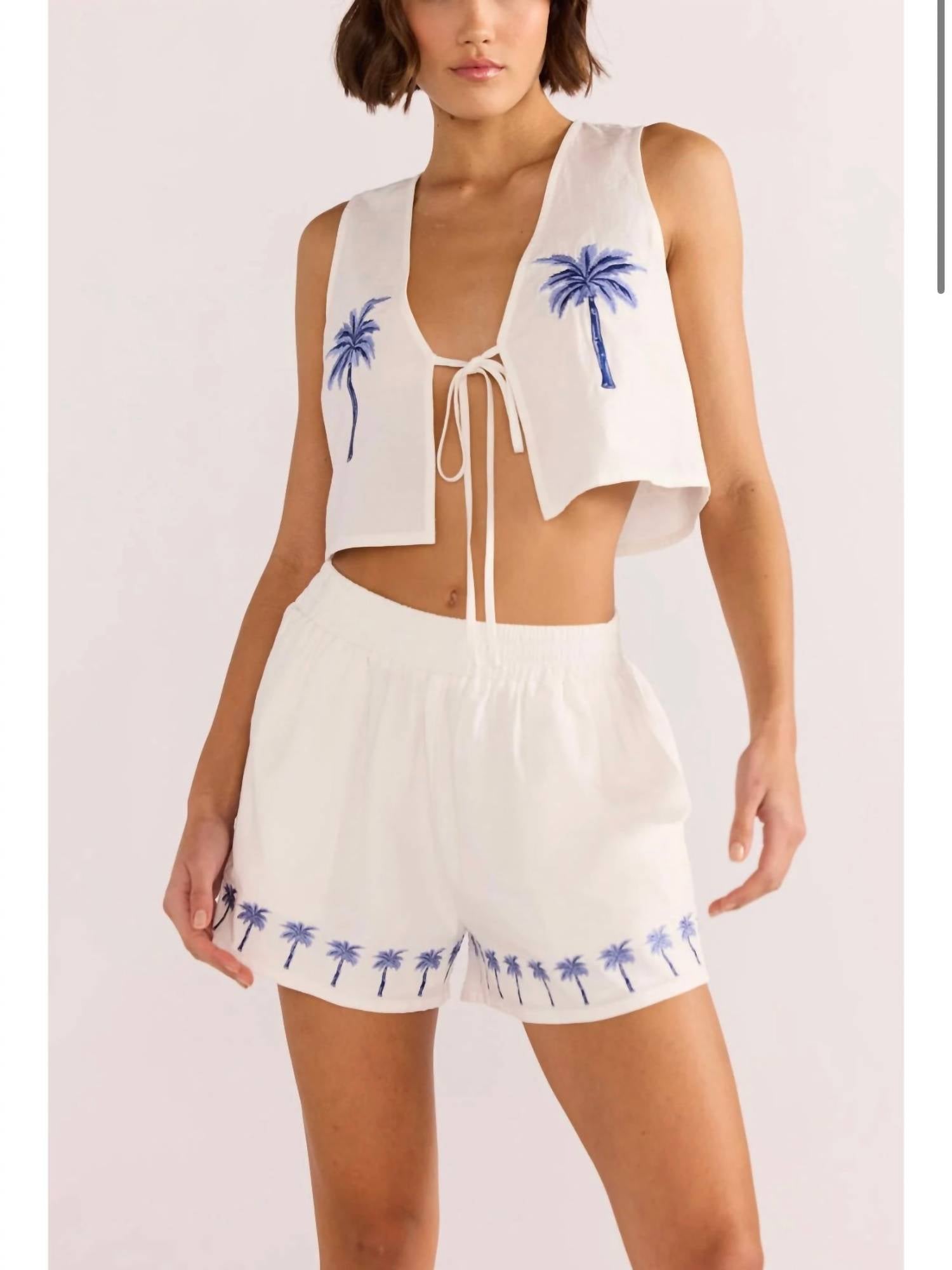 Combine este top curto com sua calça jeans de cintura alta ou saia longa favorita. O Top Bordado Isadora da MINKPINK é a sua peça-chave do verão, oferecendo um estilo descontraído e sem mangas, perfeito para as férias. Confeccionado em uma mistura de 65% algodão, 30% viscose e 5% linho, este top cropped apresenta uma estampa de palmeiras bordada que adiciona um toque divertido. Possui decote em V e fecho frontal com amarração para um caimento relaxado. Complemente seu look praiano com esta peça minimalista, ideal para usar sobre um biquíni.