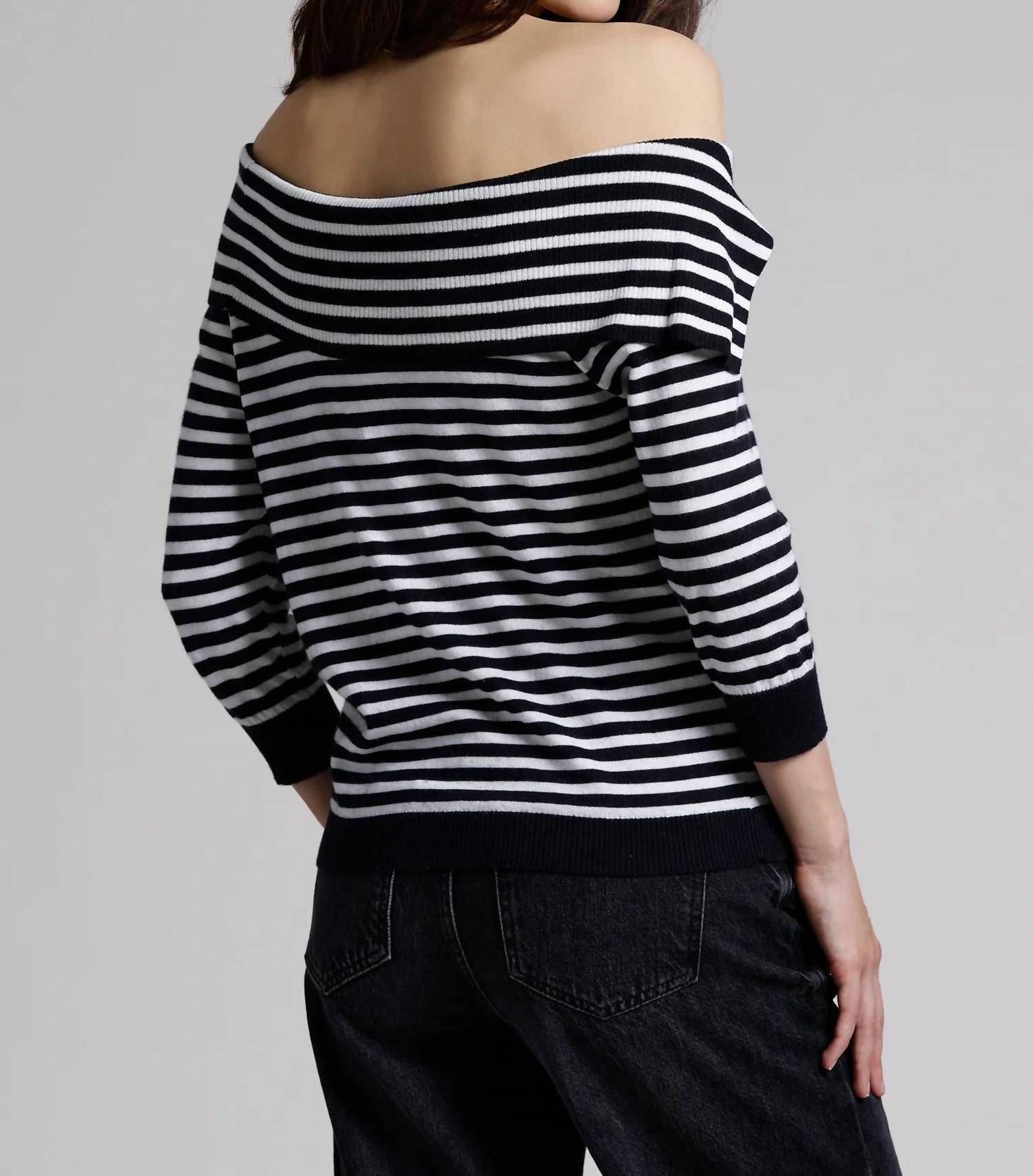 Show just the right amount of skin in the cutest sweater of the season. Elevate your style with the Cotton Cashmere Striped Off The Shoulder Top by Minnie Rose, a perfect blend of comfort and elegance. This women's top features three-quarter sleeves and a pull-on closure, crafted from a luxurious 95% Cotton and 5% Cashmere blend. The striking black and white stripe pattern offers a chic look that can be easily dressed up or down. Care for this versatile piece is simple with options for dry cleaning or machine washing.