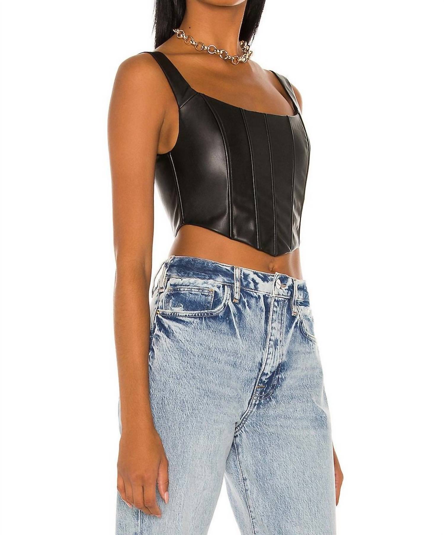 Discover the Nova Corset Hem Top by MISHA, a striking addition to your spring wardrobe in chic black. This sleek, sleeveless top features a boned bodice with a corset hem and a scoop neckline, crafted from 100% polyurethane faux leather for a modern monochrome aesthetic. The exposed back zipper ensures a secure fit. Care instructions: Spot or wipe clean only.